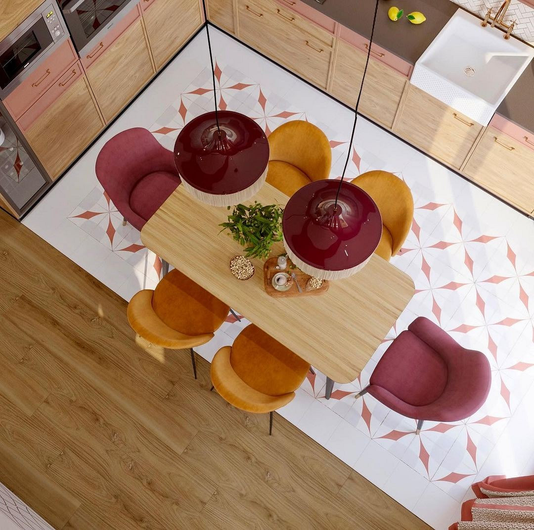 Здесь цветовая гамма построена на сочетании фактуры дерева, персикового и бежевого оттенков. Силуэты мебели в стиле ретро и матовые фасады делают кухню очень уютной и при этом лаконичной. Оживляет интерьер яркая столовая группа: овальный деревянный стол дополнили стульями с обивкой сочных ягодных оттенков. Эти глубокие тона поддерживают шторы, узор на напольной плитке и потолочные светильники. А белые пол, потолок и фартук освежают теплую палитру.