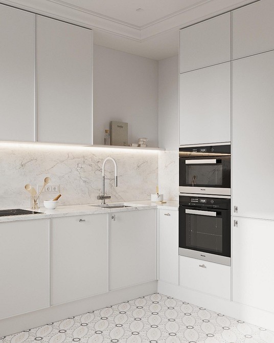 В новом сезоне белоснежные гарнитуры будут набирать популярность. В таком светлом освежающем оттенке крупная мебель смотрится легко и воздушно, а зона готовки кажется более просторной и нарядной. Такая палитра отлично сочетается с трендом на спа-кухни, ведь в сочетании с натуральными материалами и ненавязчивым природным декором светлое пространство дает то самое ощущение умиротворения и отпускное настроение.