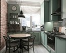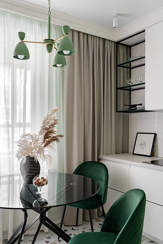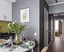 В этом проекте задачу решили так: установили вместительный угловой гарнитур со всей необходимой техникой, а столовую группу разместили напротив. Жильцов двое, поэтому выбрали небольшой круглый стол с двумя стульями. Дополнительное место для чаепития организовали на балконе.