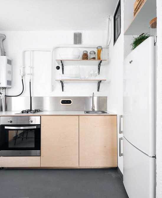 Можно сделать нагреватель максимально незаметным, подобрав модель под цвет стен. Как это сделали на фото дизайна этих маленьких кухонь с колонкой.