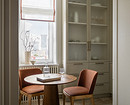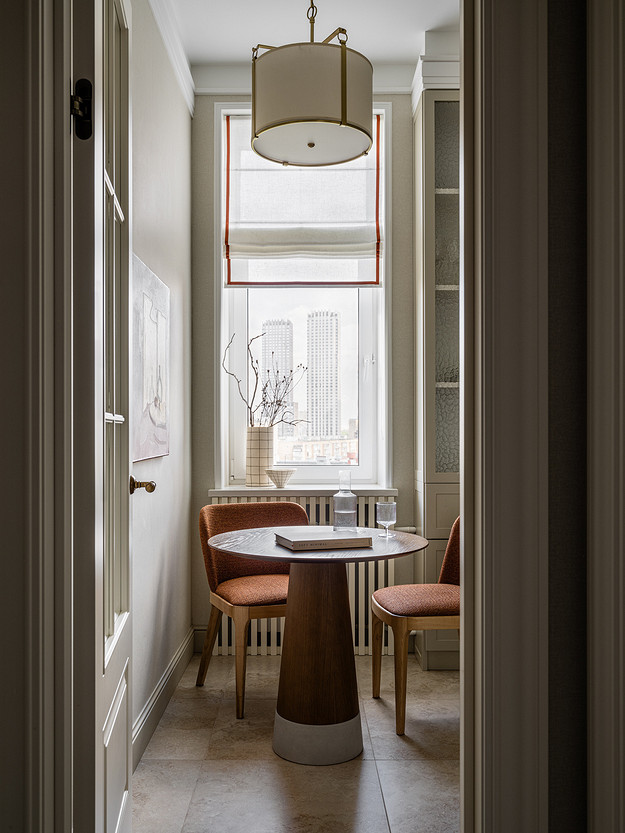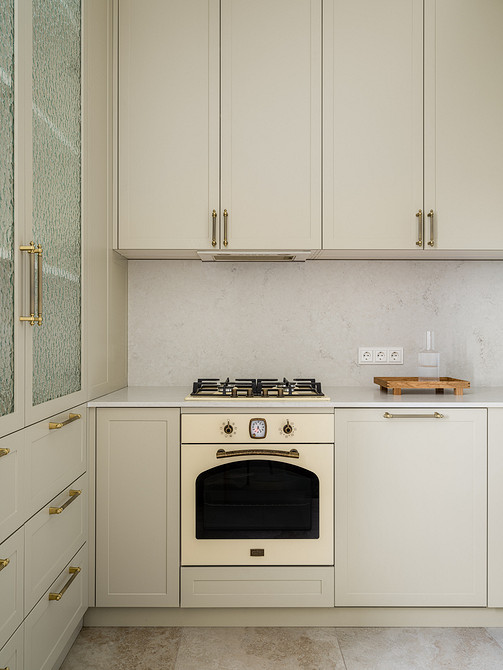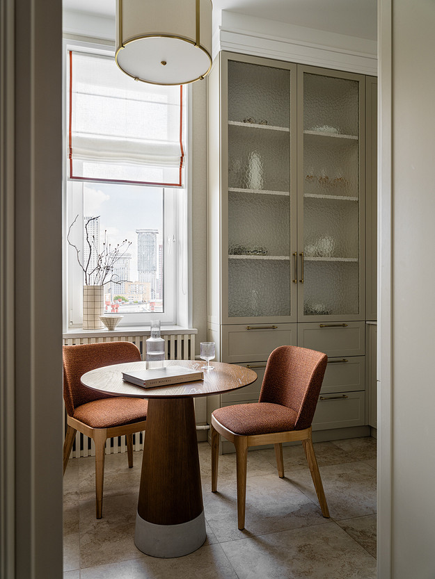 На небольшой кухне появился вместительный П-образный гарнитур, в котором скрыли всю технику и газовое оборудование. Вместо старого линолеума уложили крупноформатный керамогранит, стены оклеили светлыми обоями — характерный прием для классического стиля. Историческую атмосферу подчеркнули высокими дверями с остеклением, витриной и изящным обеденным столом из орехового шпона.