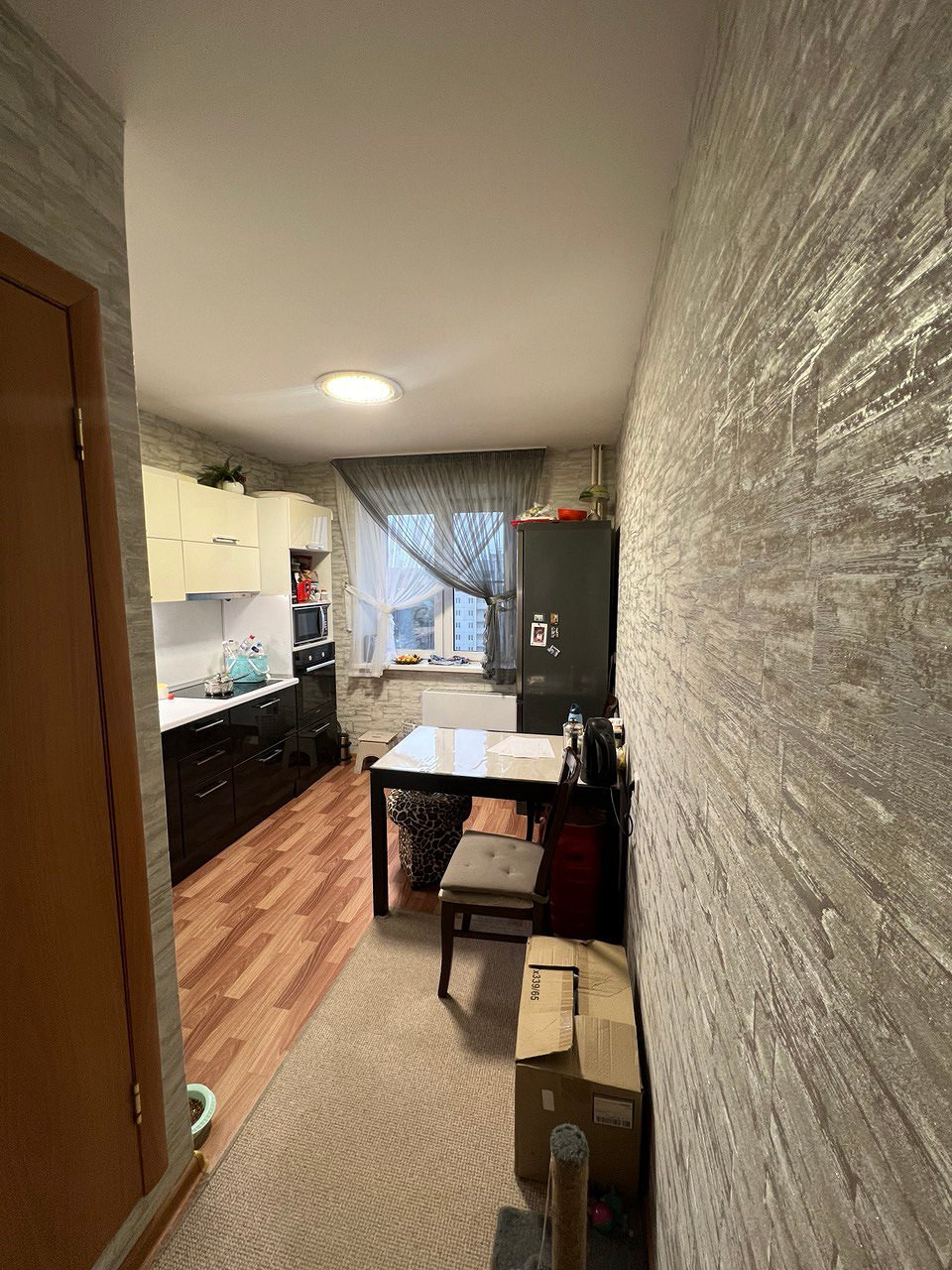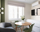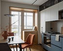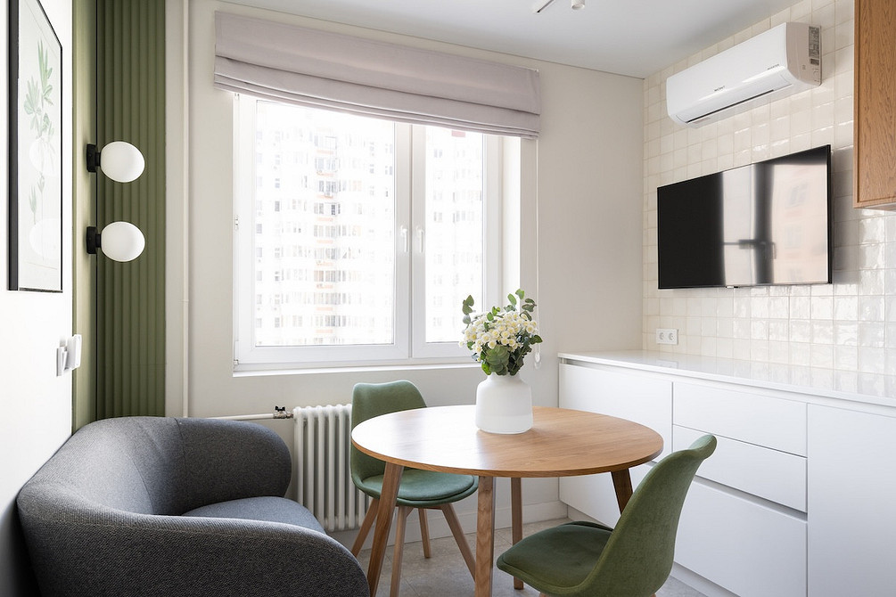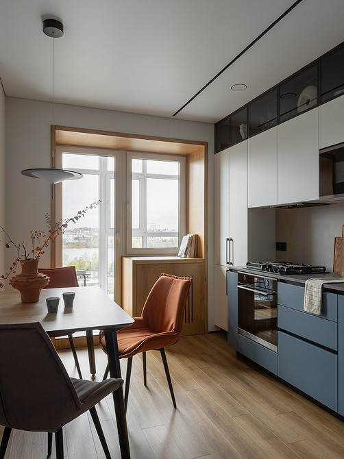 Оставшуюся часть помещения отвели под обеденную зону с диванчиком — отдельной гостиной в квартире нет. Нашлось место даже для кошачьего домика, который идеально вписался по дизайну в общую картину. Теперь на кухне может проводить время вместе вся семья, включая питомца.