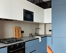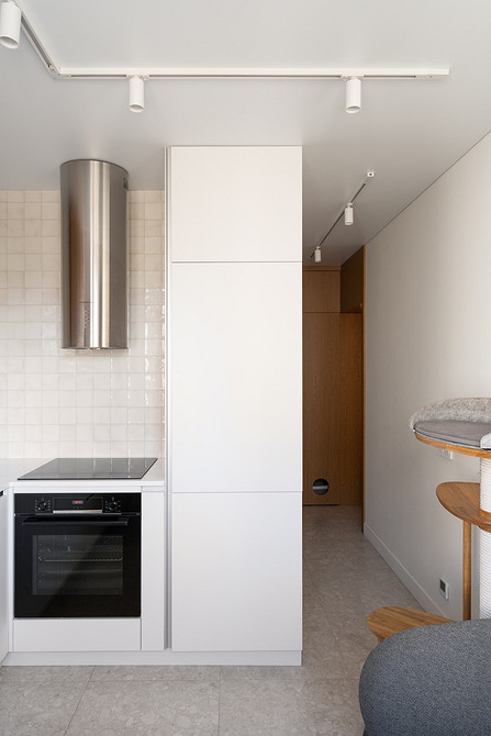 Отделку обновили: стены окрасили, на пол уложили инженерную доску, потолок сделали натяжным со скрытым профилем. Особенностью проекта стала продуманная зона для кошек хозяйки: под духовым шкафом сделали нишу для кормушек, благодаря чему они не мешают проходу.