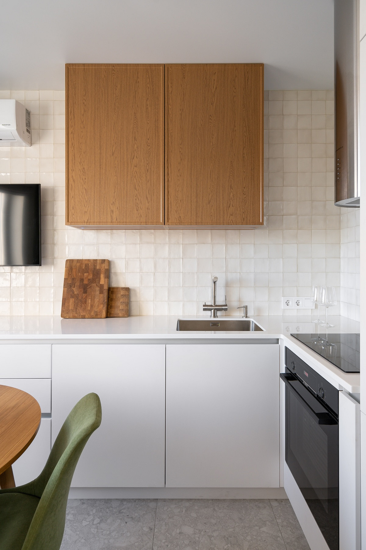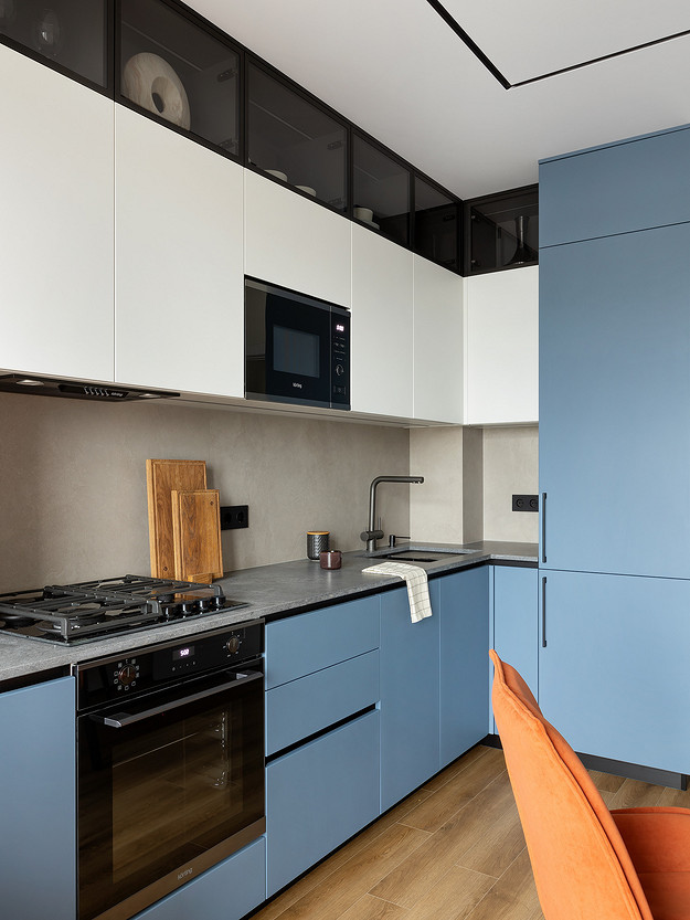 Гарнитур сделали угловым, увеличив хранение за счет антресольных шкафов со стеклянными фасадами и подсветкой. Старые подоконники и откосы заменили шпонированными панелями, которые плавно переходят в короб, скрывающий радиатор. Чтобы не мешать выходу на балкон, уменьшили глубину крайнего шкафчика, а внутри спрятали газовый счетчик и трубы. Всю технику встроили.