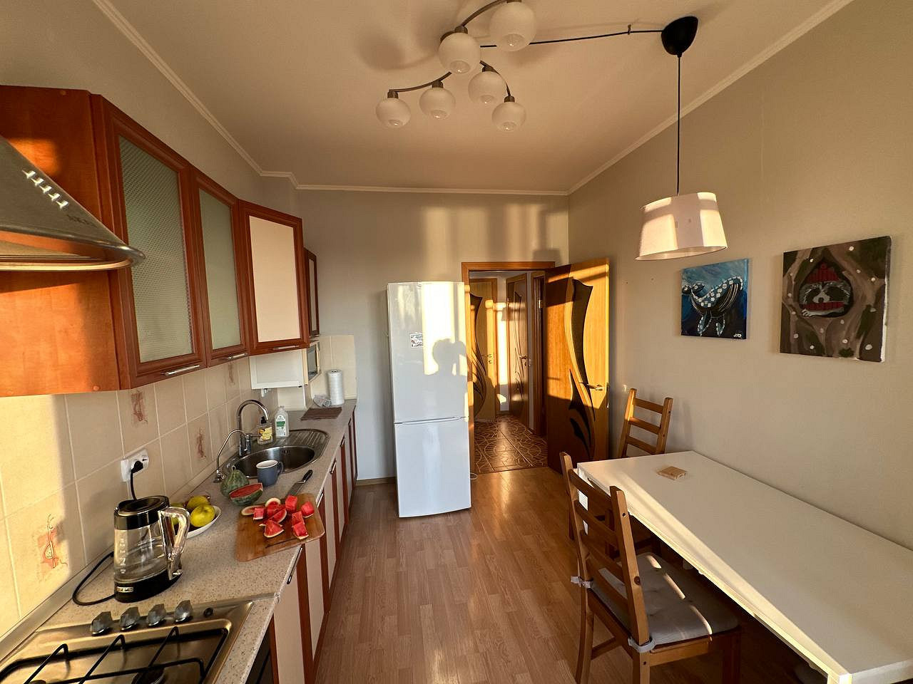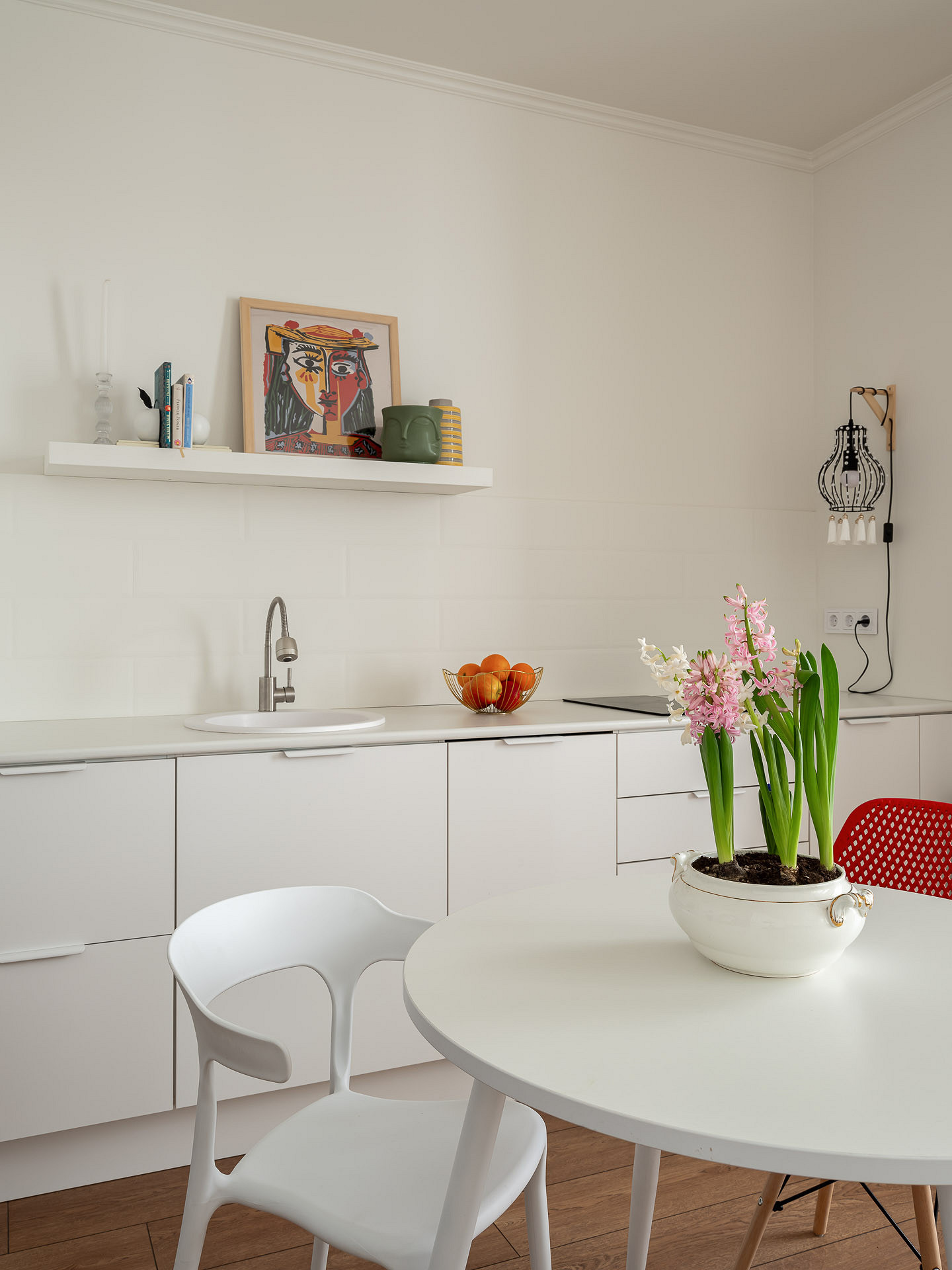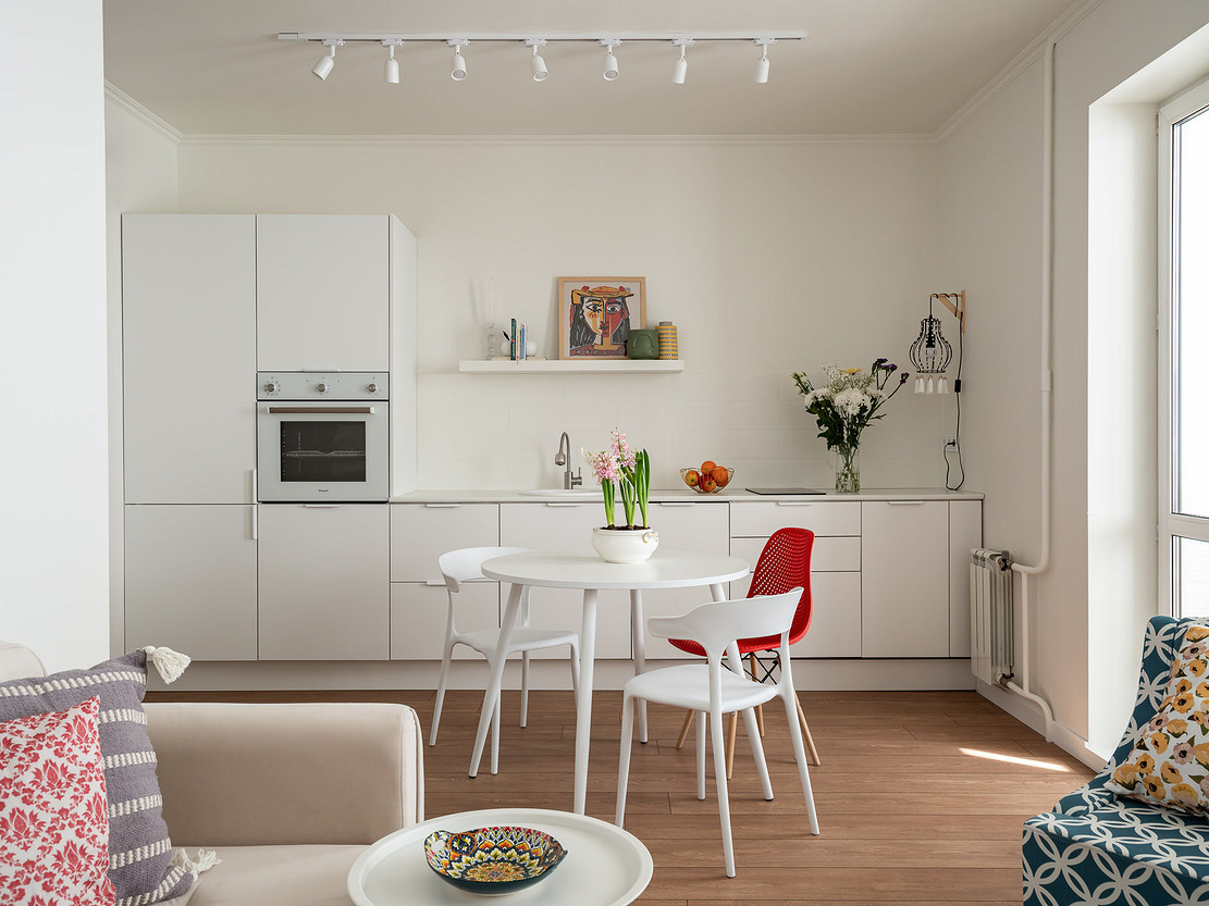 Стены, потолок и даже фартук из плитки выкрасили в белый цвет — комната сразу стала визуально просторнее, появился фон для ярких акцентов. Тот же эффект дал отказ от верхних шкафов — и заодно позволил сэкономить. Темный гарнитур заменили белым, чтобы выдержать единую гамму и избежать слишком резких контрастов. Небольшие детали вроде картин и фигурного светильника добавляют изюминку, и интерьер не выглядит скучным.