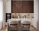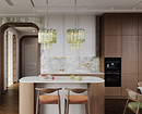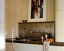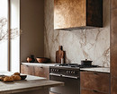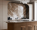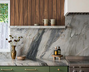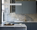 Для фартука камень используют преимущественно в виде цельных панелей, часто из того же материала делают столешницу. Облицовка вписывается в большинство стилей, но особенно гармонично смотрится в минимализме, классике и неоклассике, ар-деко и модерне.