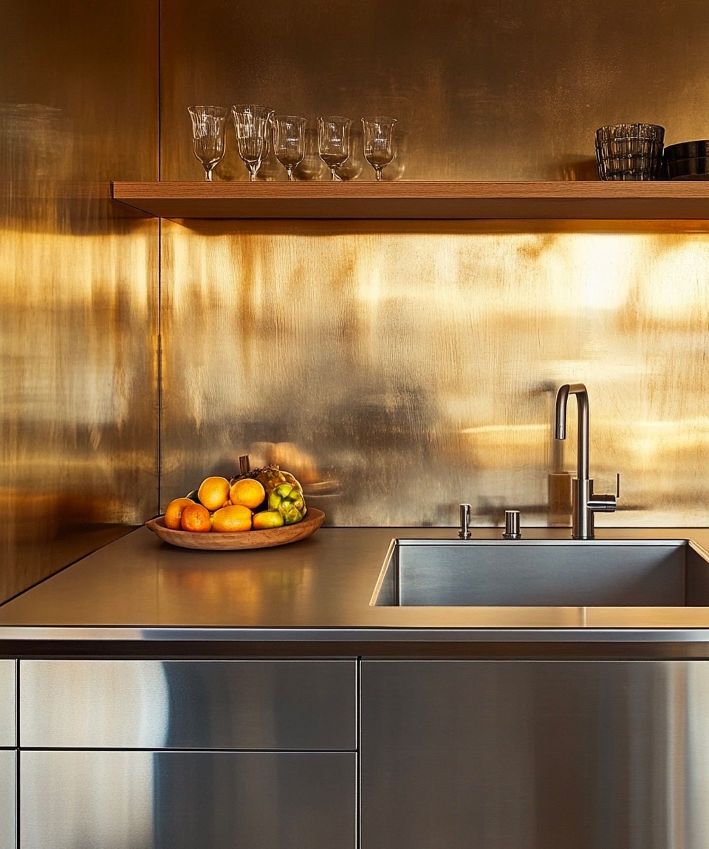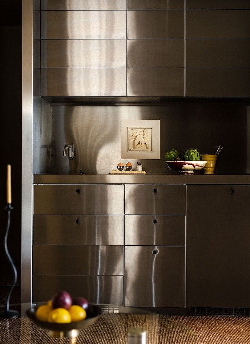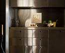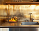 - Металл — фартук закрывают листами нержавейки, латуни или алюминия. Хорошо смотрятся в сочетании с однотонными фасадами, популярны в лофте и эклектике. Материалы устойчивы к высоким температурам, но чувствительны к кислотным чистящим средствам и постоянному контакту с водой.