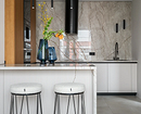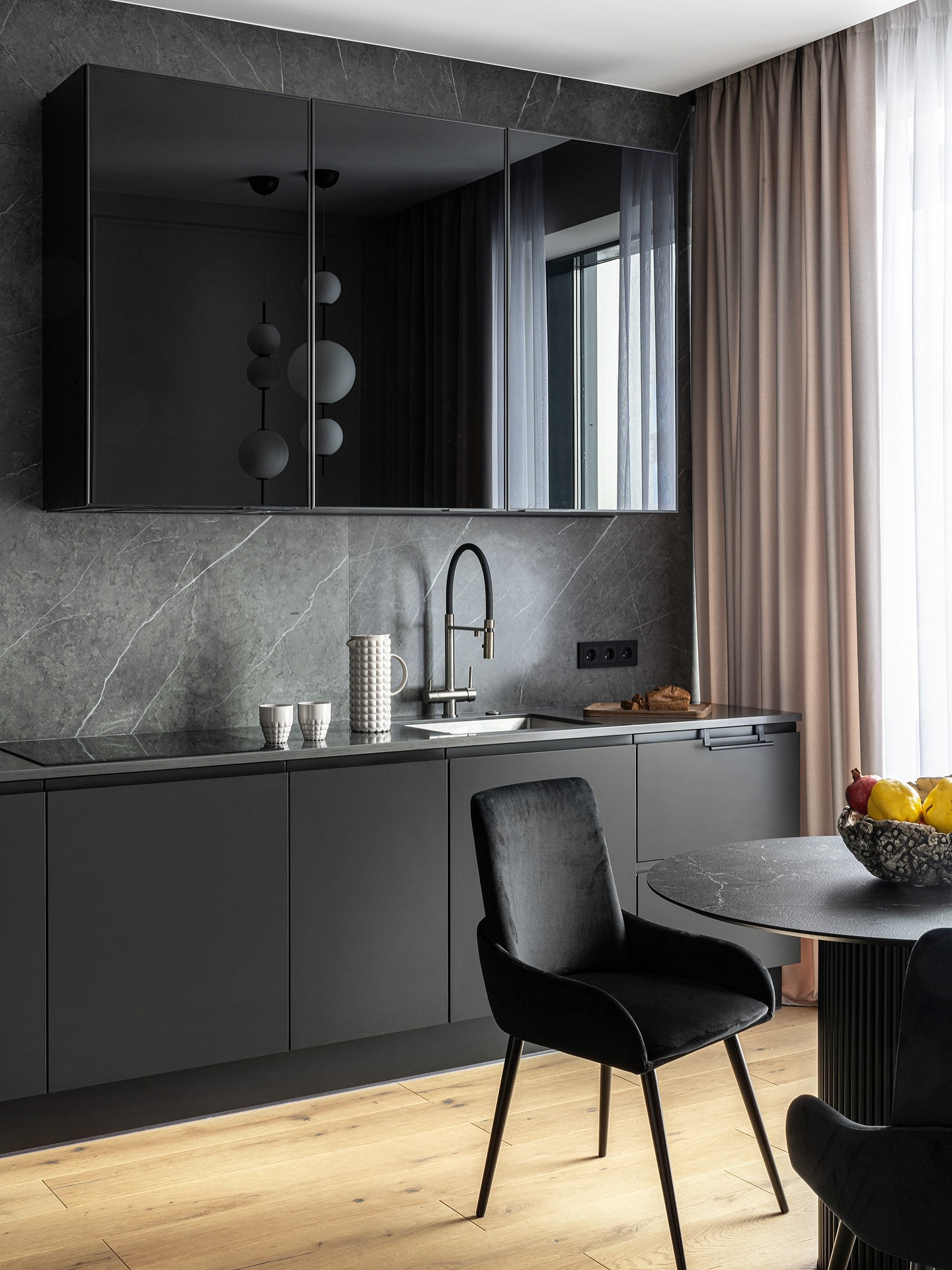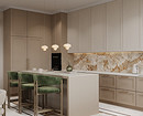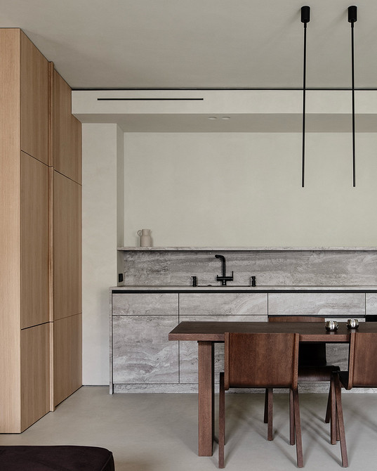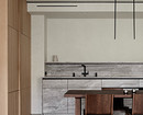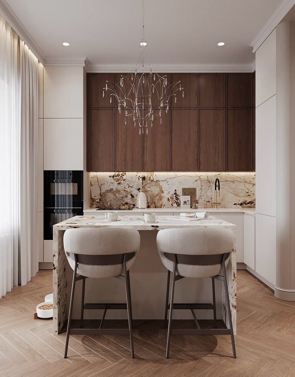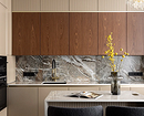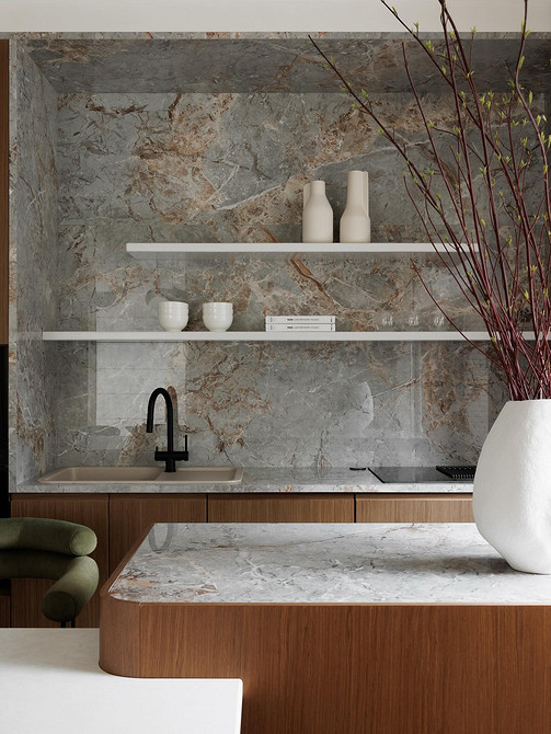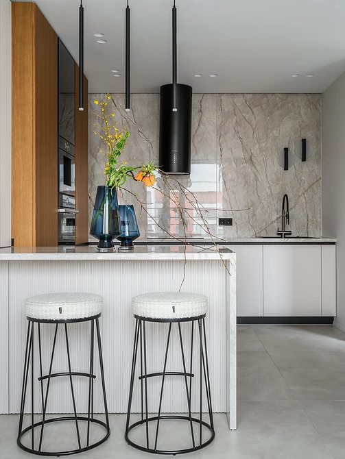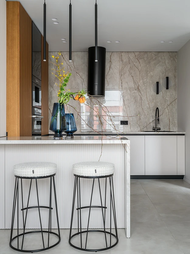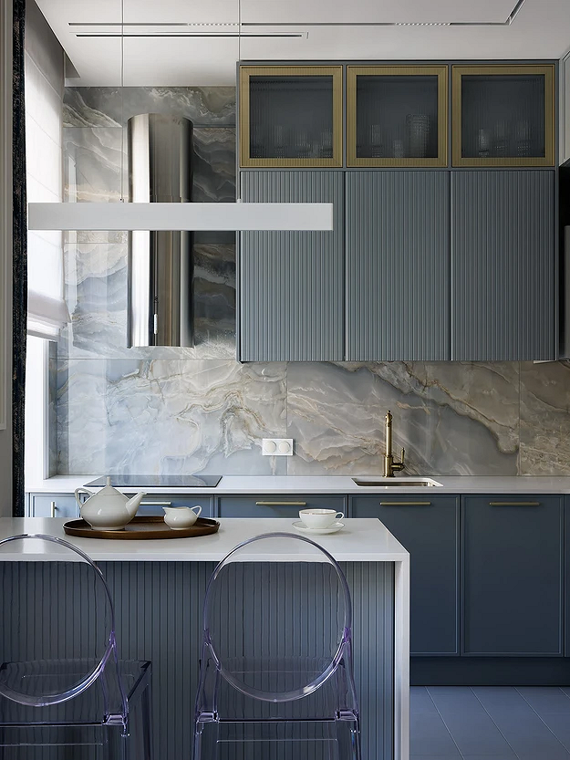 Крупные плиты позволяют оформить фартук с минимумом стыков. Это делает кухню аккуратнее: нет сетки швов, рисунок минерала или другой фактуры не прерывается, за счет этого интерьер выглядит сдержаннее и дороже.