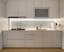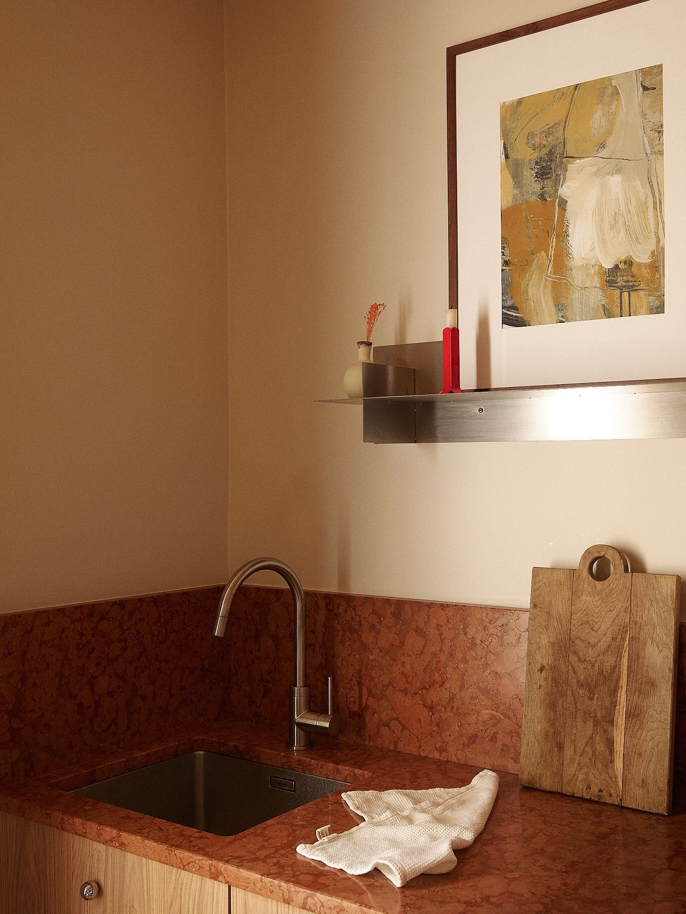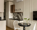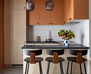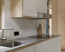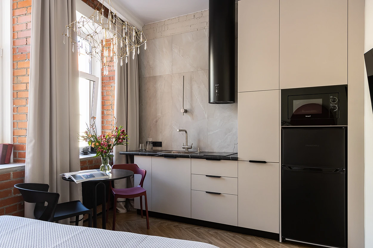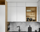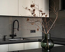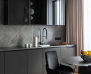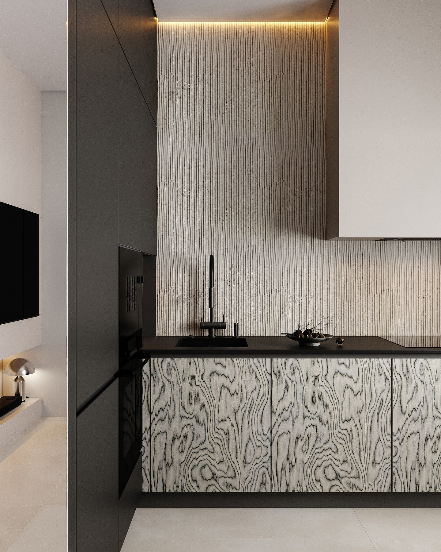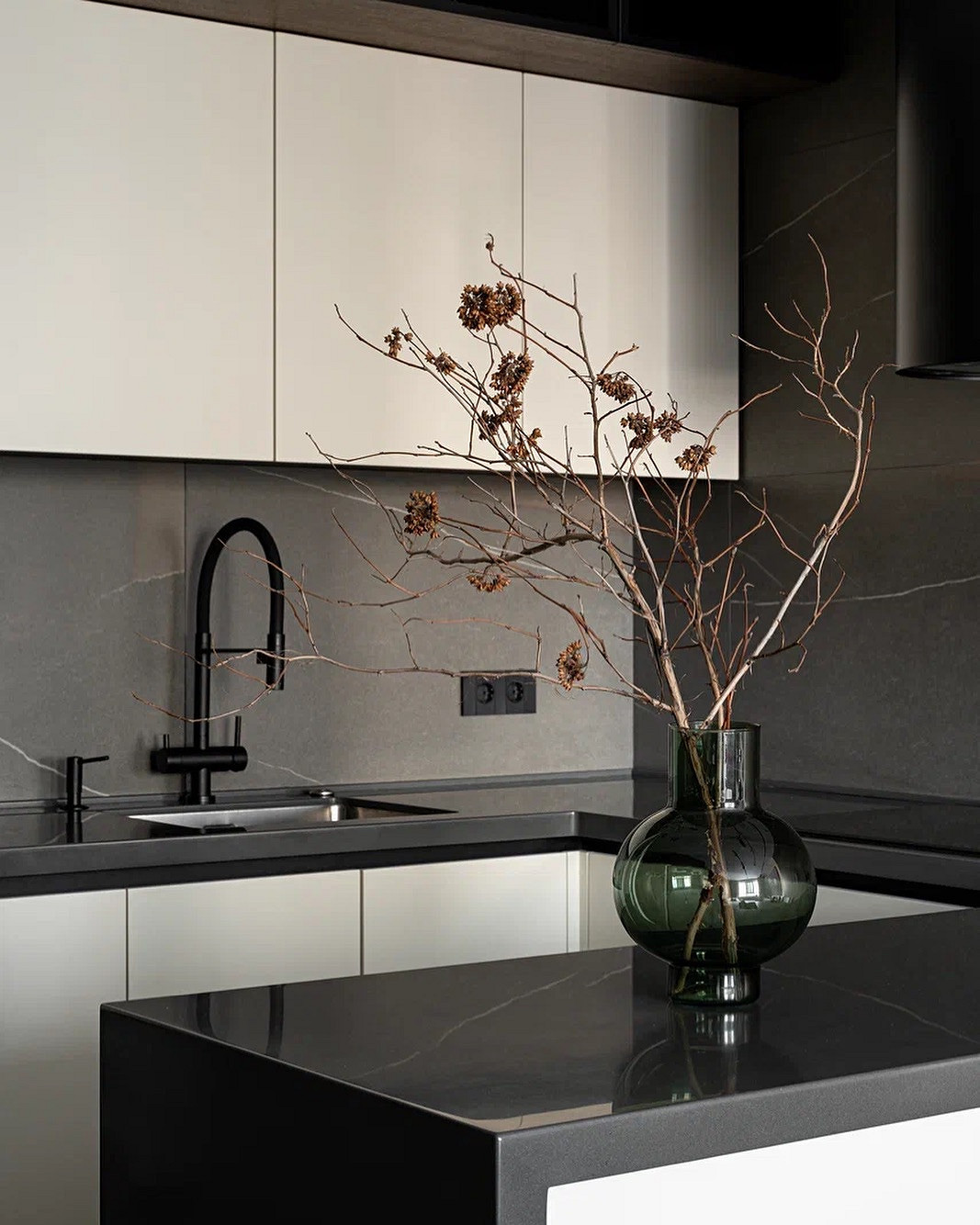 Крупные плиты позволяют оформить фартук с минимумом стыков. Это делает кухню аккуратнее: нет сетки швов, рисунок минерала или другой фактуры не прерывается, за счет этого интерьер выглядит сдержаннее и дороже.