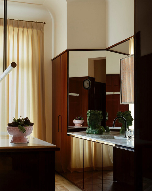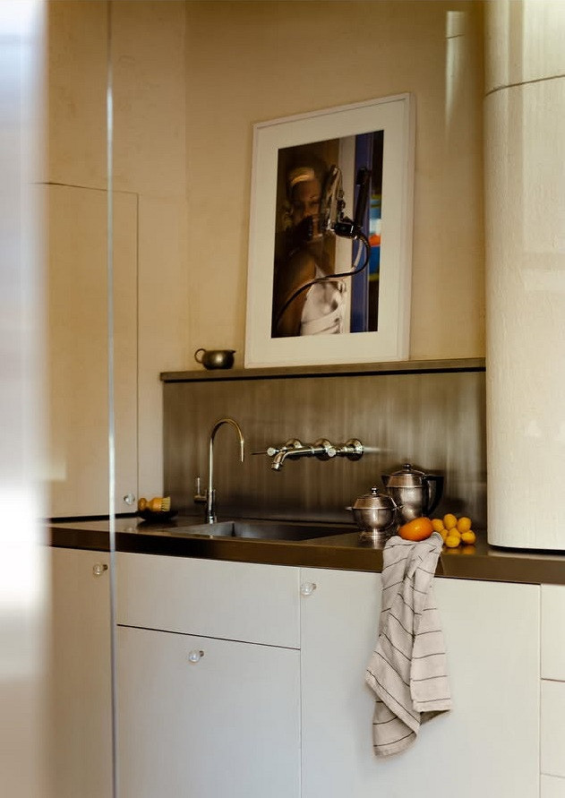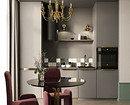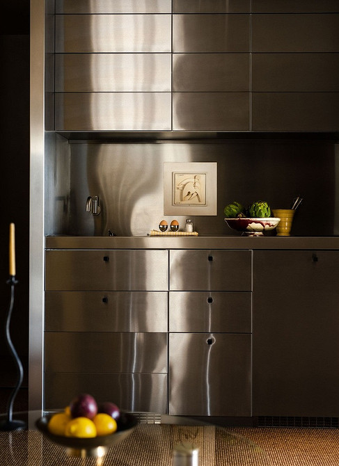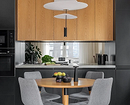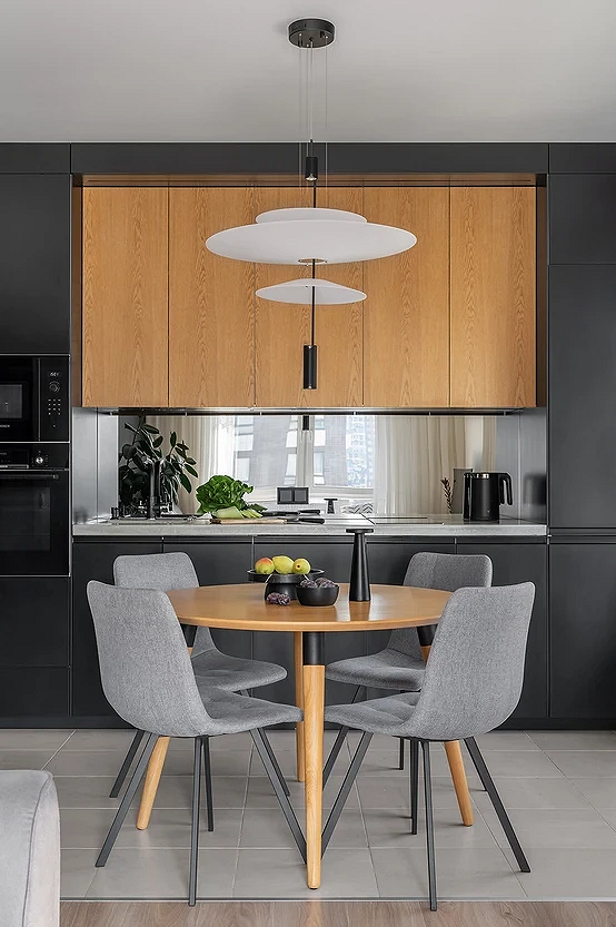 - Зеркала — редкий, но очень эффектный прием. Чаще всего их используют в эклектичных интерьерах и квартирах, где мало готовят дома. Зеркальные панели — маркие и легко царапаются, поэтому за ними нужен постоянный уход.
