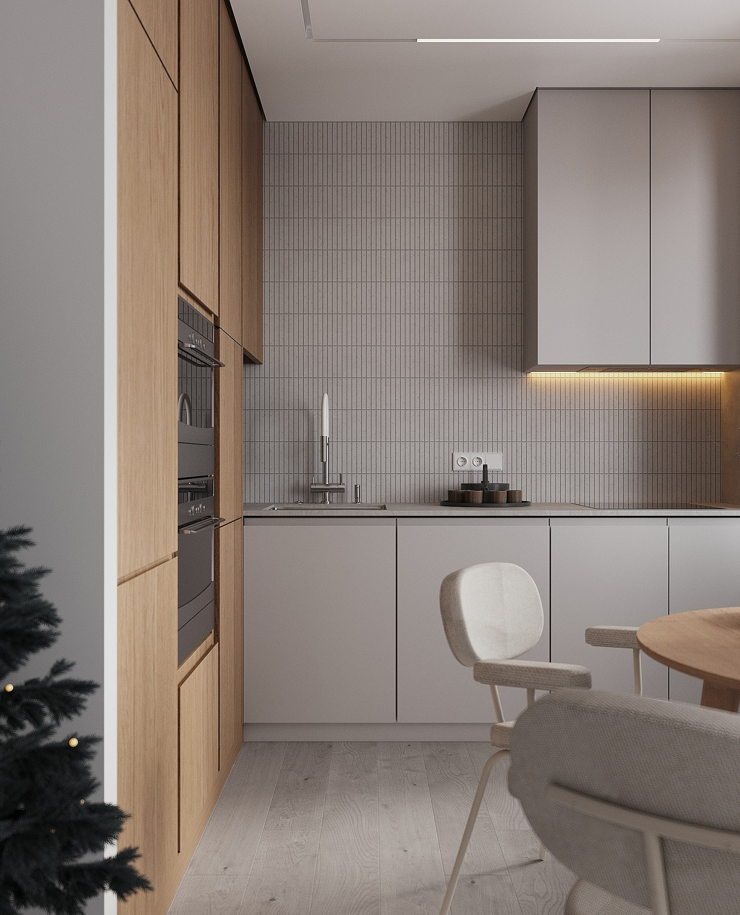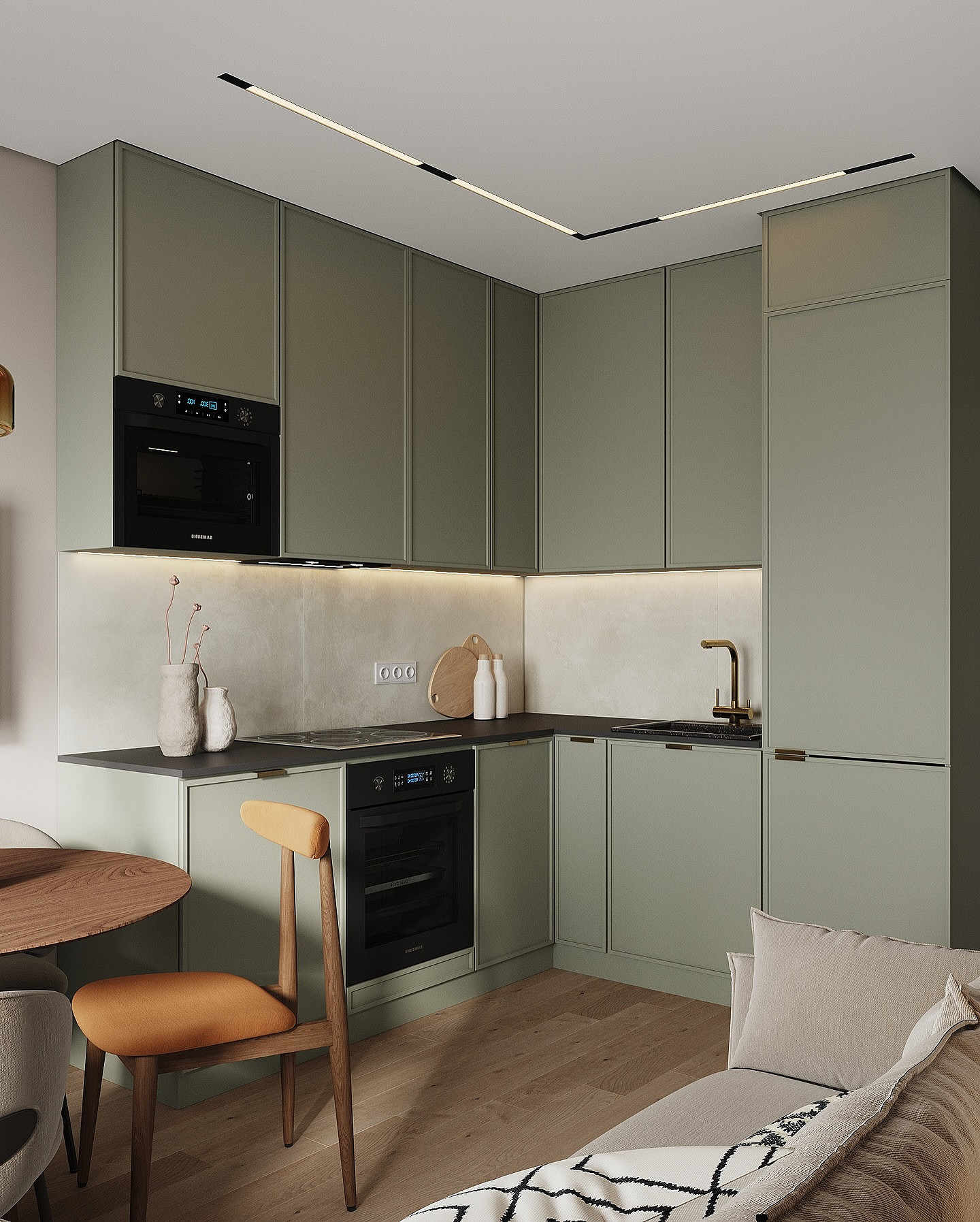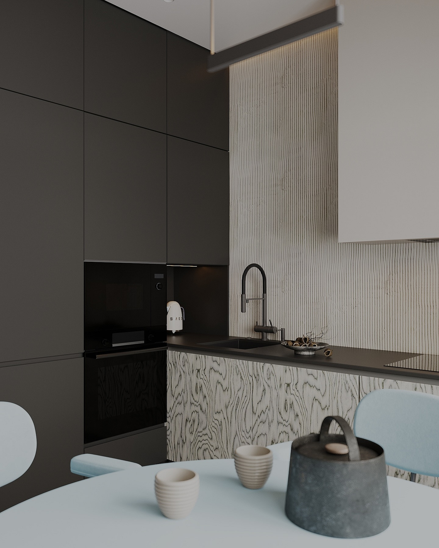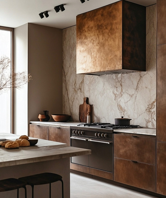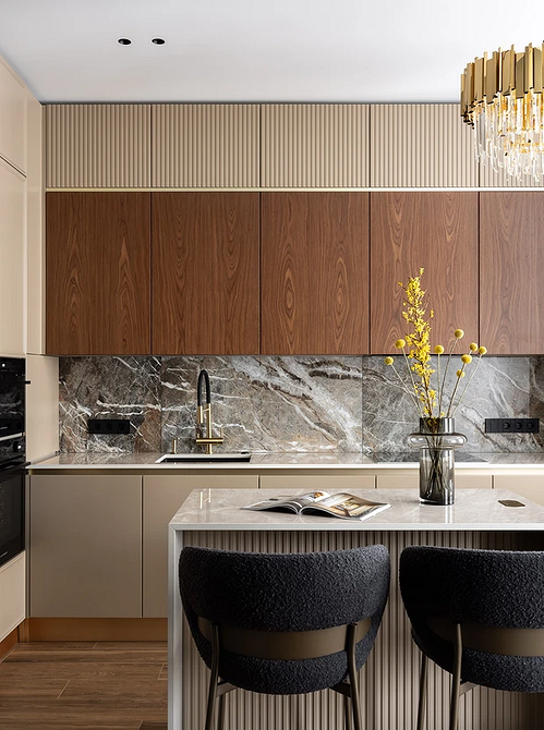 В оформлении зоны готовки все так же главенствует лаконичность, при этом отделочные материалы становятся более тактильными и выразительными. Рассмотрим, какие фартуки для кухни будут модными в 2026-м, на примере основных трендов.