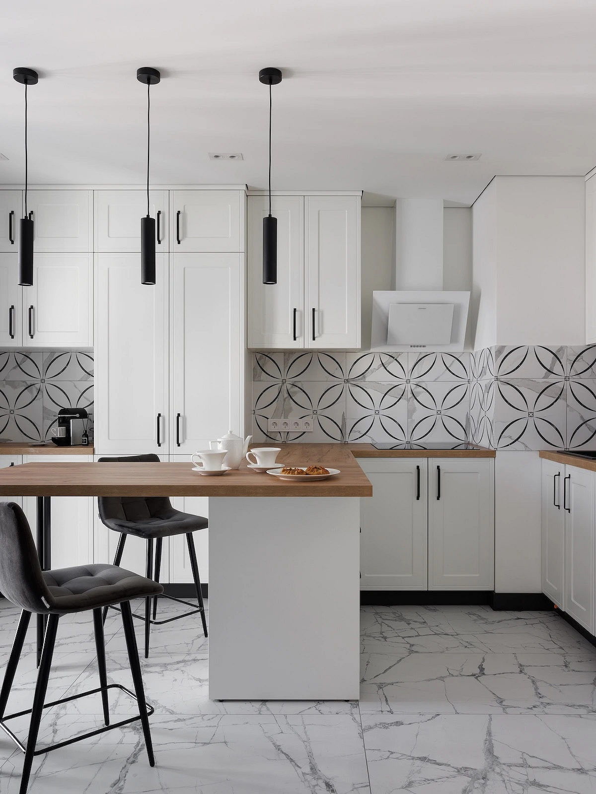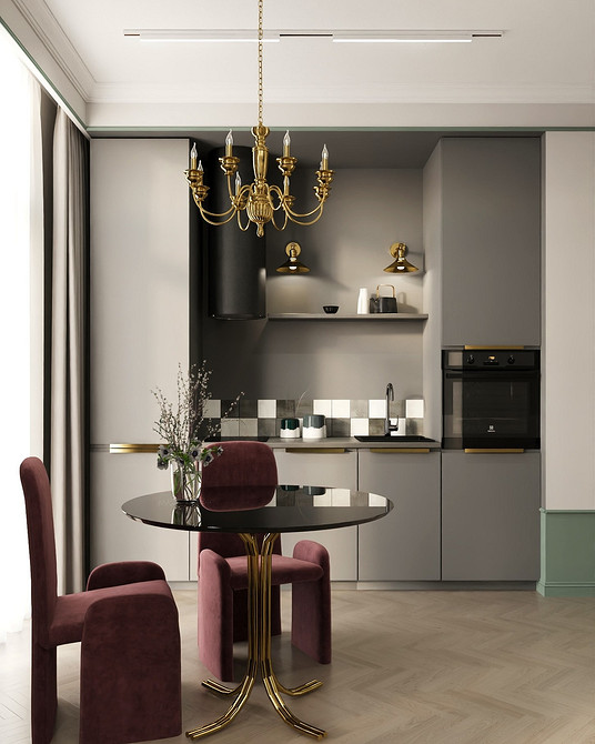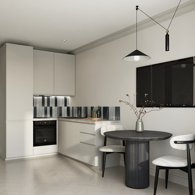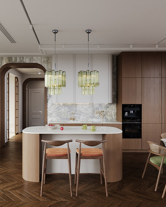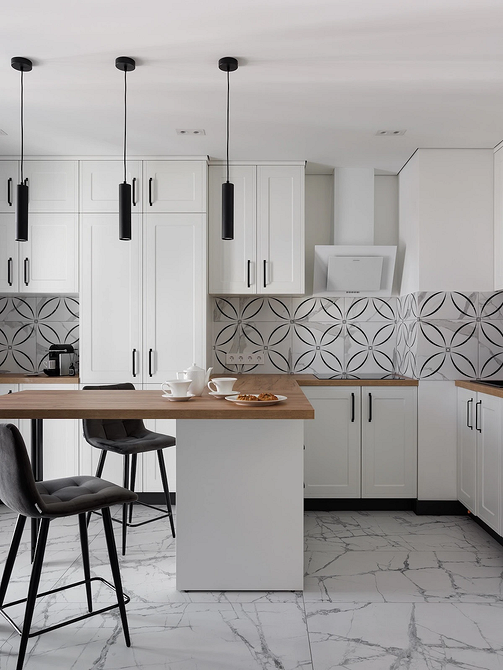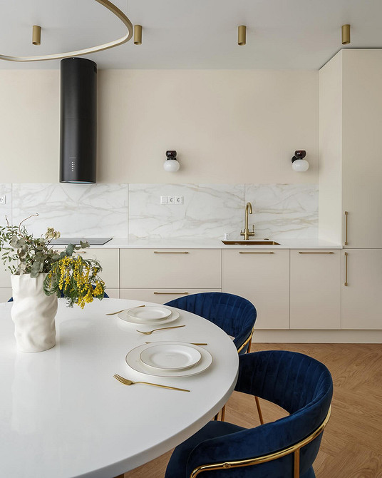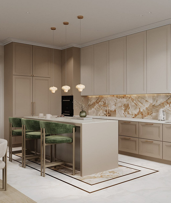 Тренд применим во всех стилях, где важно сохранить визуальную сдержанность. Его часто используют в классике и неоклассике, джапанди, скандинавском стиле, минимализме в духе quiet luxury. Часто фартук становится единственной выразительной деталью, благодаря чему кухня не выглядит перегруженной.