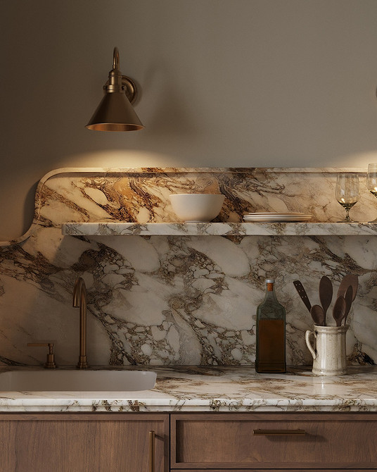 Мрамор остается одной из самых востребованных фактур для фартука, но в 2026 году набирают популярность и другие виды камня — с более разнообразным природным рисунком.