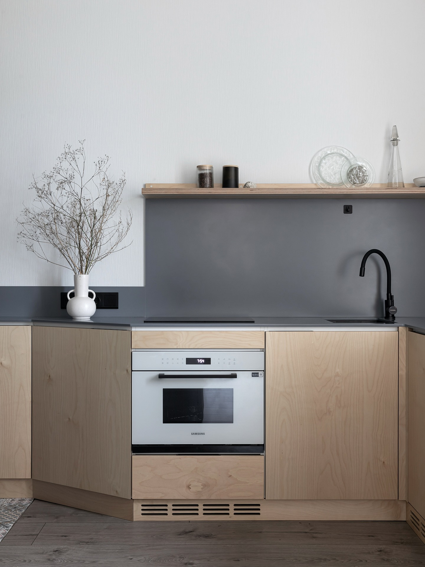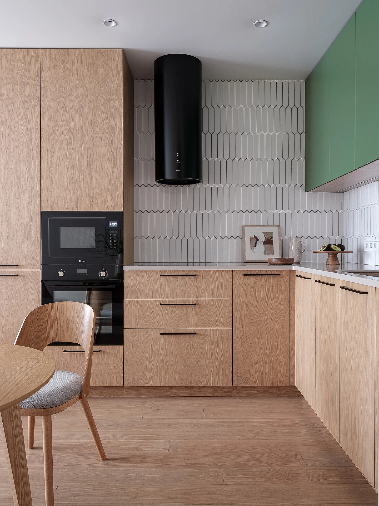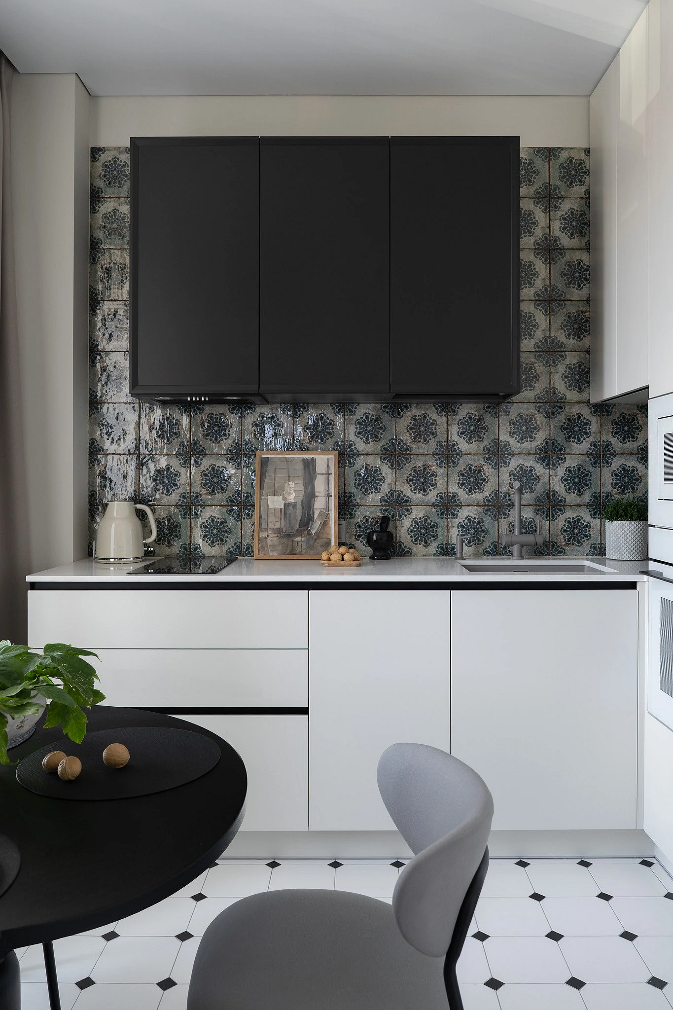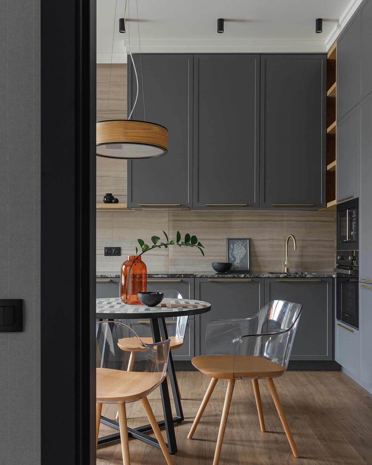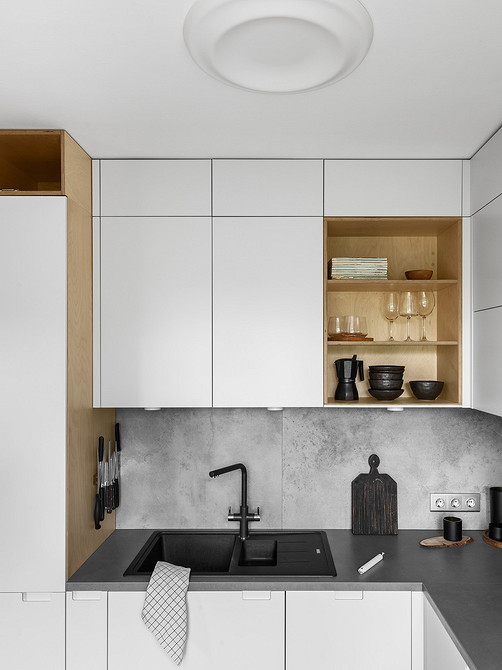 На фартуках без глянца не так заметны брызги и загрязнения, они не бликуют и не создают визуальный шум. Оформление стилистически универсально, подходит и для сканди, и для лофта, и для строгой классики.