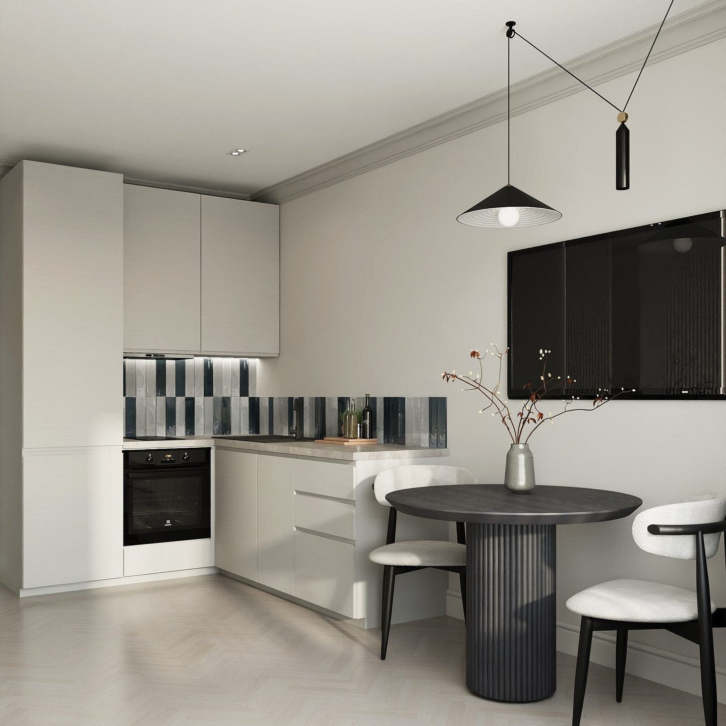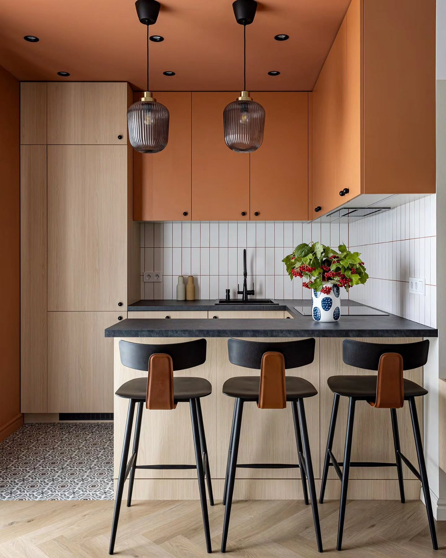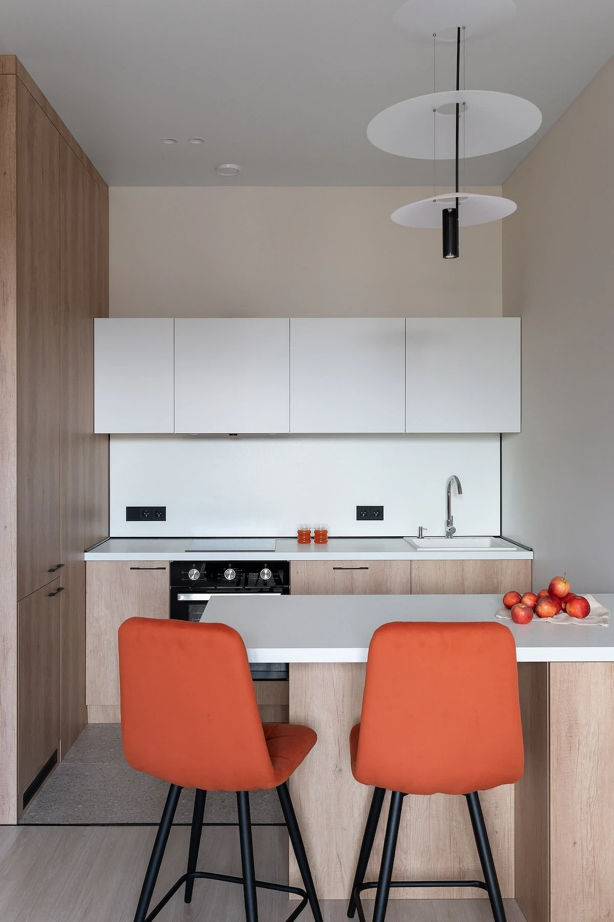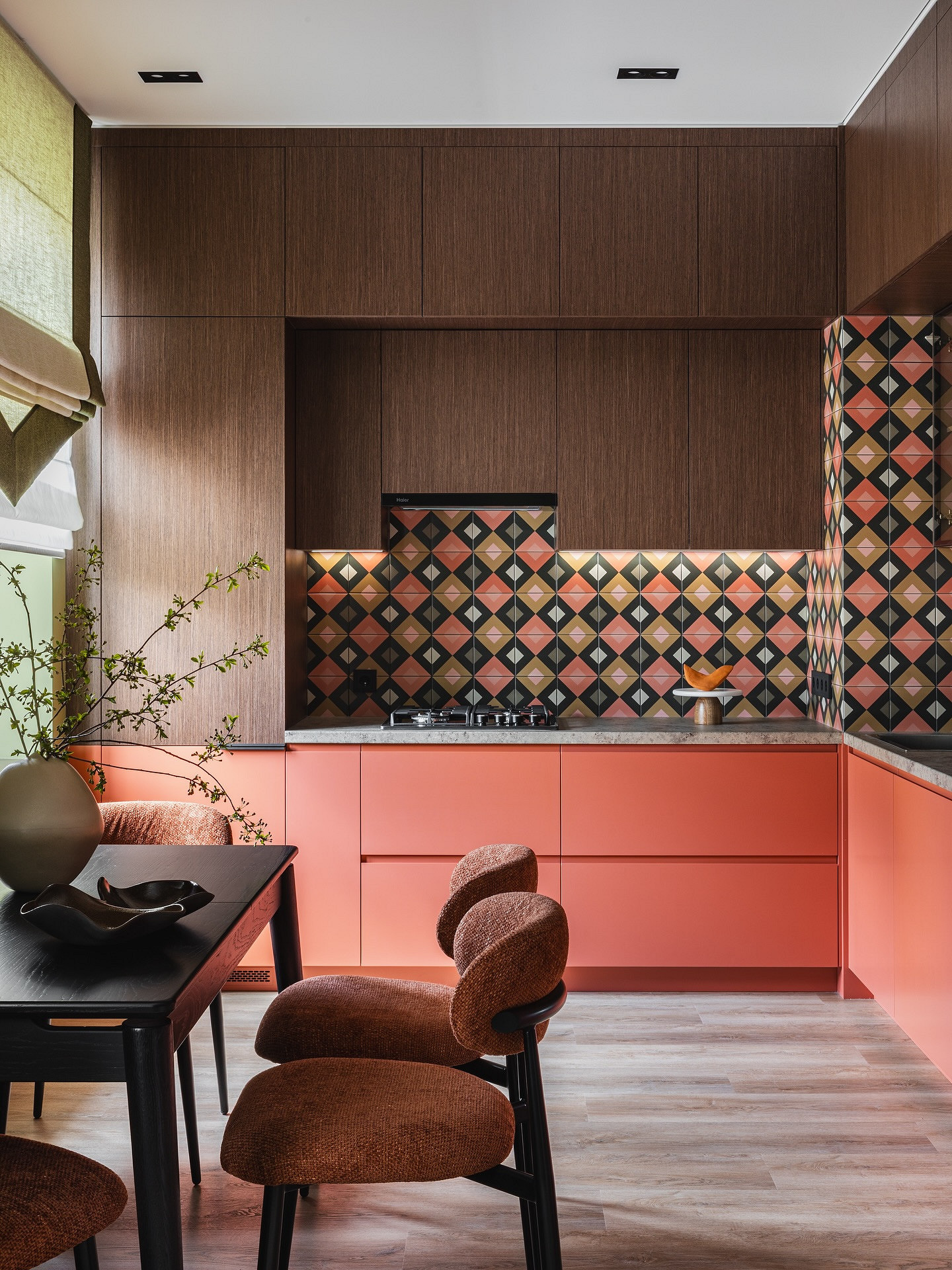 На фартуках без глянца не так заметны брызги и загрязнения, они не бликуют и не создают визуальный шум. Оформление стилистически универсально, подходит и для сканди, и для лофта, и для строгой классики.