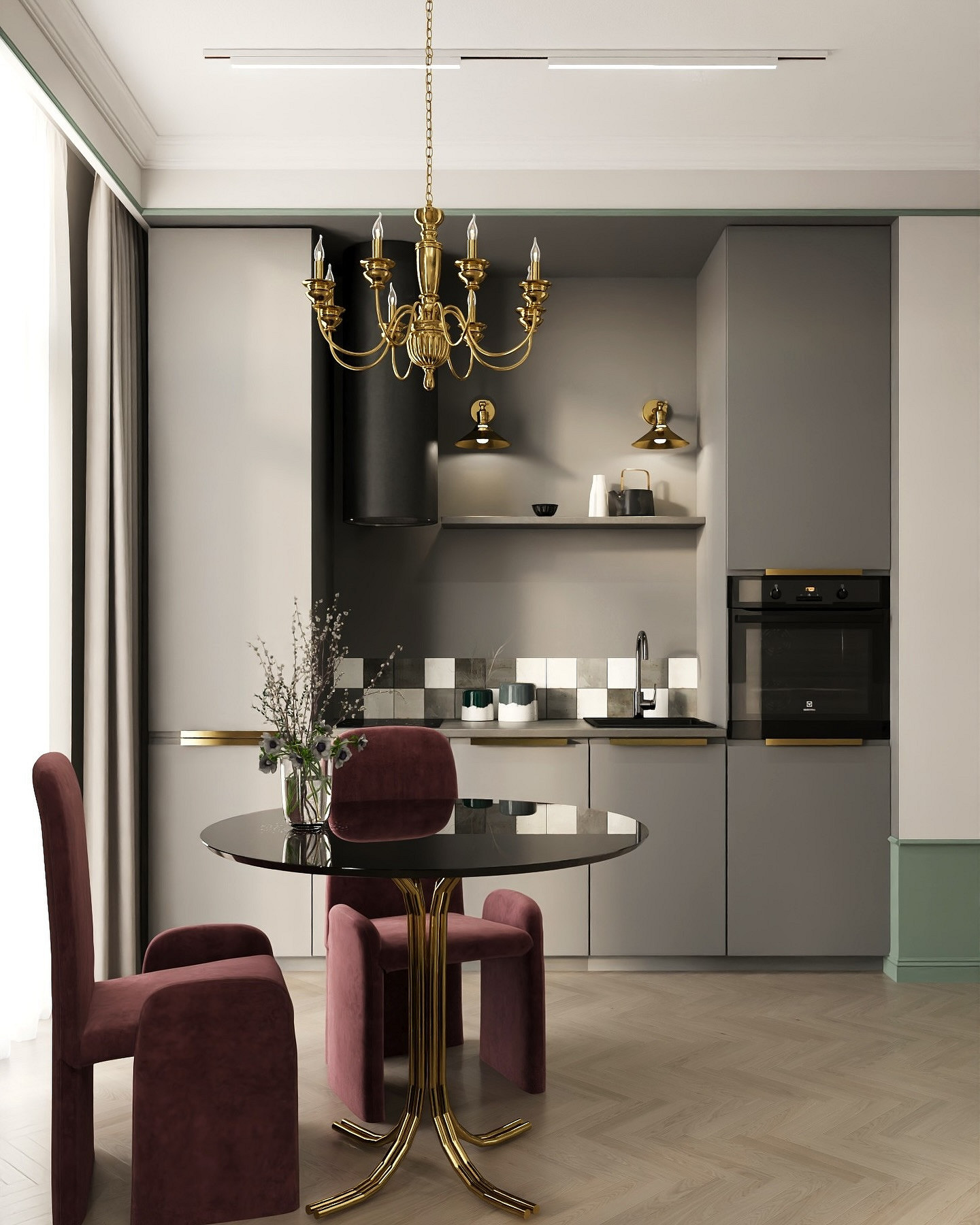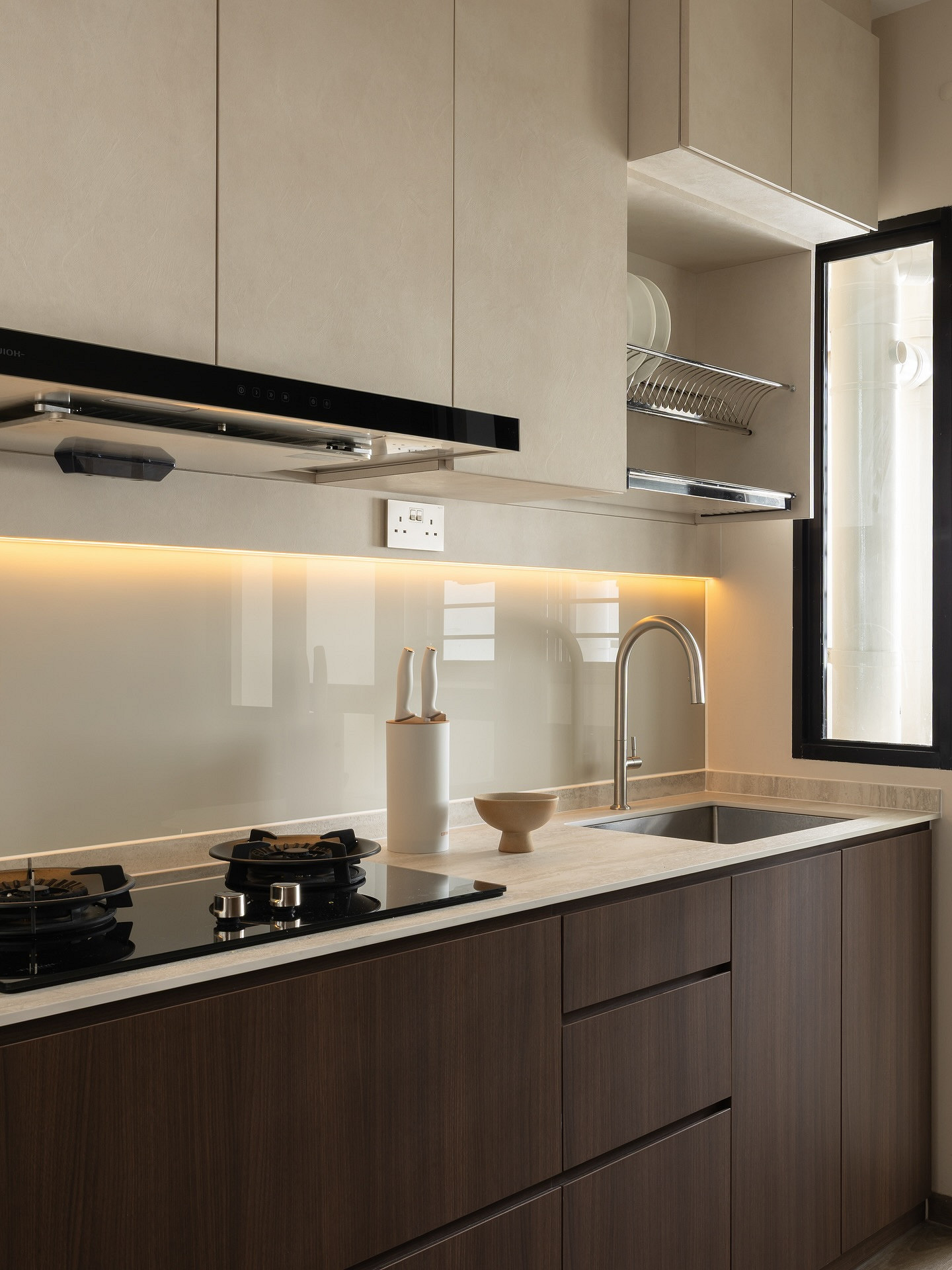 Чаще всего такой вариант выбирают для гарнитуров без верхних шкафчиков или комбинированных систем. Фартук становится ненавязчивым фоном для вытяжки, полок или освещения. При желании его можно скомбинировать: поднять до потолка только за плитой, а по остальной длине оставить классическую высоту.