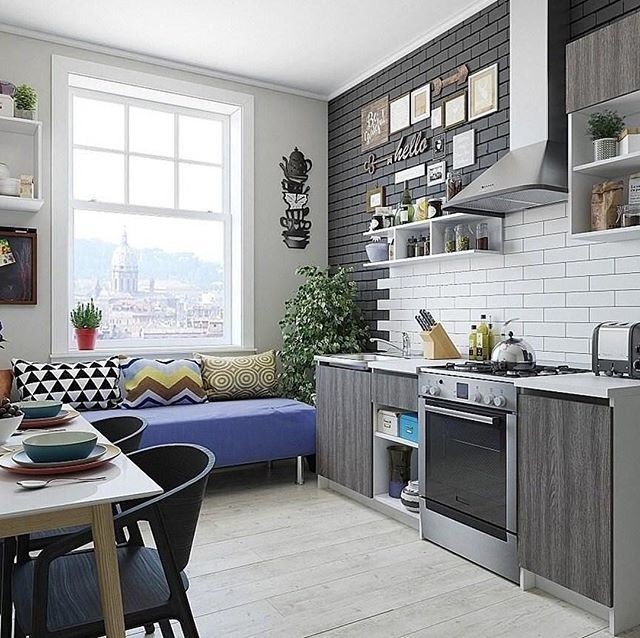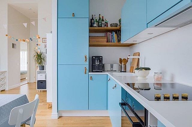 - Открытыми полками, кстати, можно заменить часть навесных шкафов. Если посуда и другие вещи на них будут гармонировать со стилем всей кухни и их будет немного, визуального хаоса можно избежать.