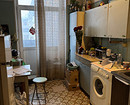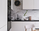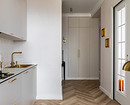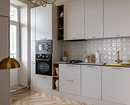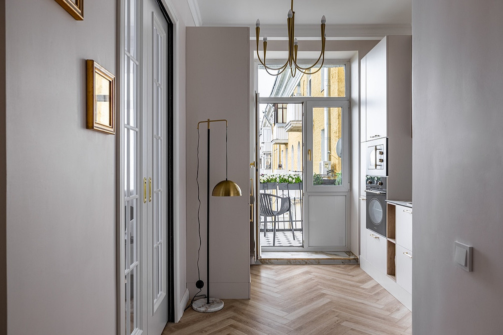 Эту квартиру в сталинке дизайнер Виктория Аз-Зари переделывала как инвестиционный проект, то есть для последующей перепродажи. Интерьер нужно было сделать современным, но сохранить атмосферу дома сталинской эпохи. Кухня была довольно узкой и темной. Часть ее «забрали» под хозяйственный шкаф в прихожей в процессе перепланировки. Кроме того, соединили кухню с гостиной раздвижными стеклянными дверями. Обновленное пространство стало более светлым, обеденную группу вынесли в гостиную, чтобы освободить место. Гарнитур разделили на две части: с одной стороны — мойка, варочная панель, колонна с духовым шкафом и СВЧ, а напротив — колонны со встроенным холодильником и местами для хранения.