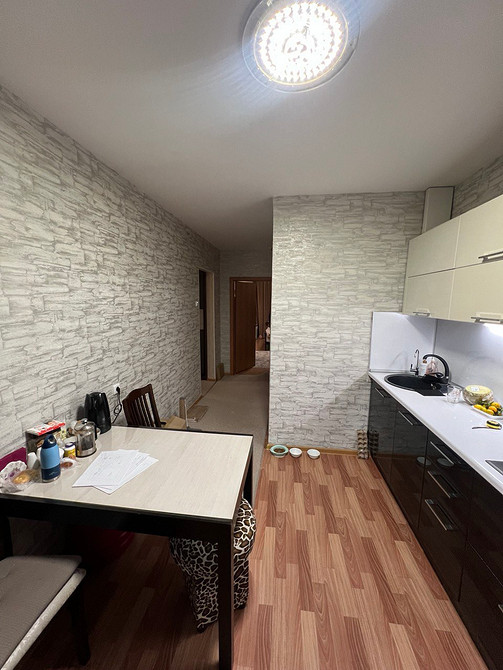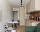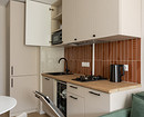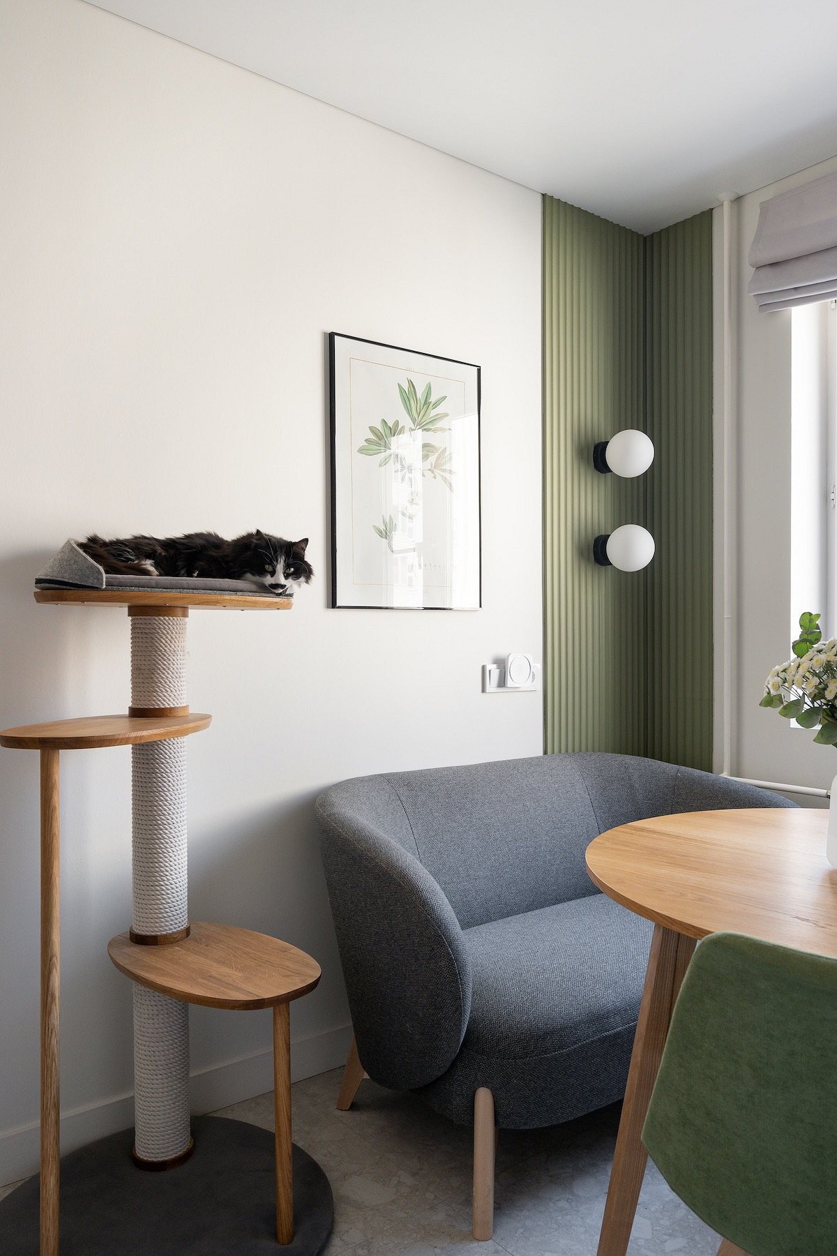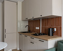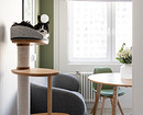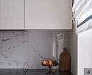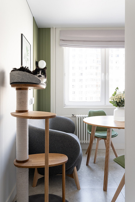 Эту квартиру дизайнер Владислава Николаева переделывала по заказу девушки, которая подарила ее своей маме по случаю выхода на пенсию и переезда из деревни в город. Требовался нейтральный интерьер с вместительными системами хранения. У хозяйки — два кота, и на кухне планировали расположение мебели и техники, учитывая потребности питомцев. Так, под колонной со встроенной техникой оставлена ниша, куда встанут лотки для корма и автоматическая поилка. В целом же, наполнение кухни продумано в соответствии с современным комфортом: много места для хранения, встроенная техника — холодильник, духовой шкаф, СВЧ, посудомоечная машина. У окна — обеденная группа, состоящая из круглого стола и стульев. А для уютного вечернего освещения — люстра над столом. Помимо этого предусмотрен и яркий свет в виде точечных светильников.