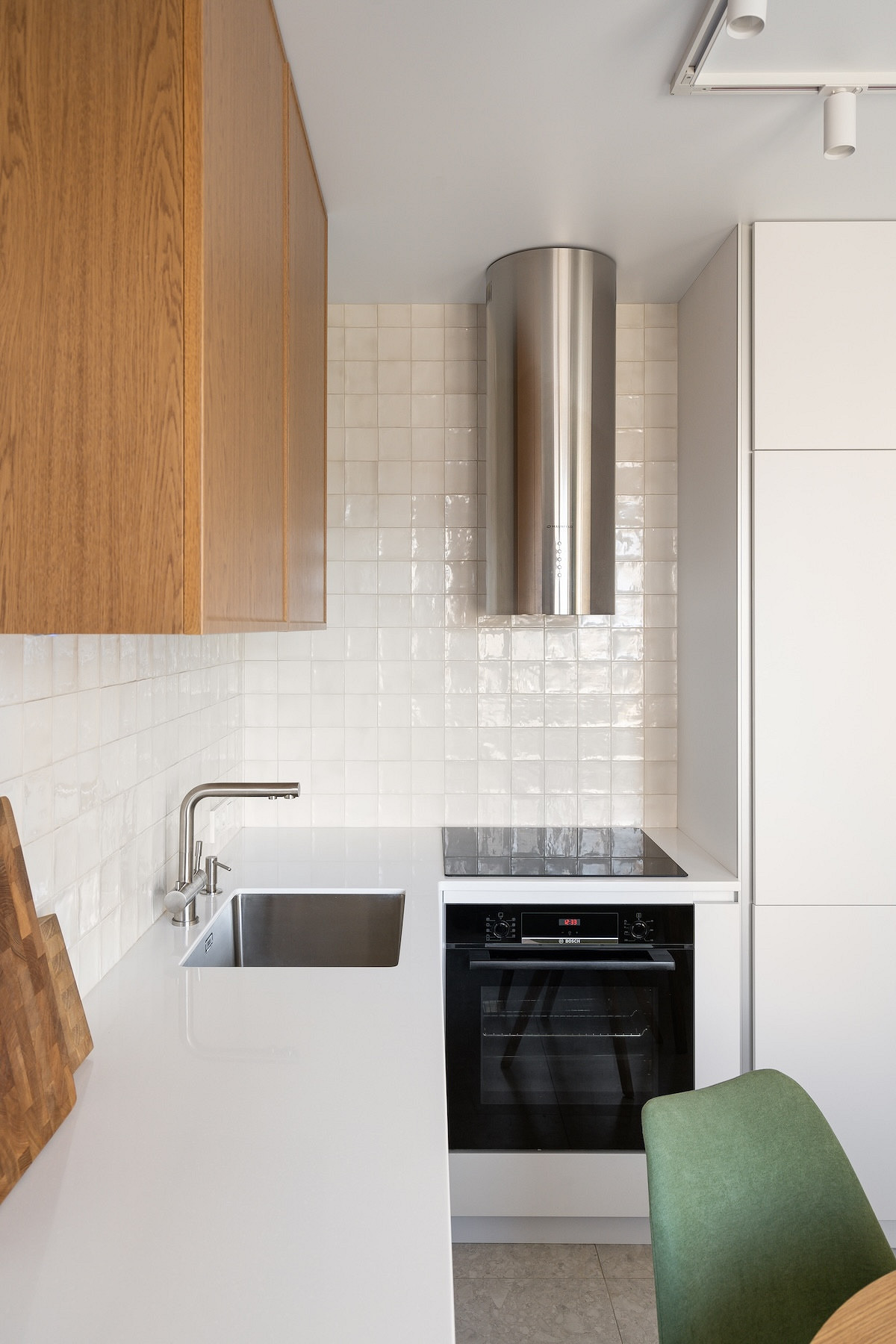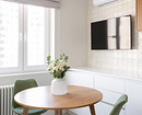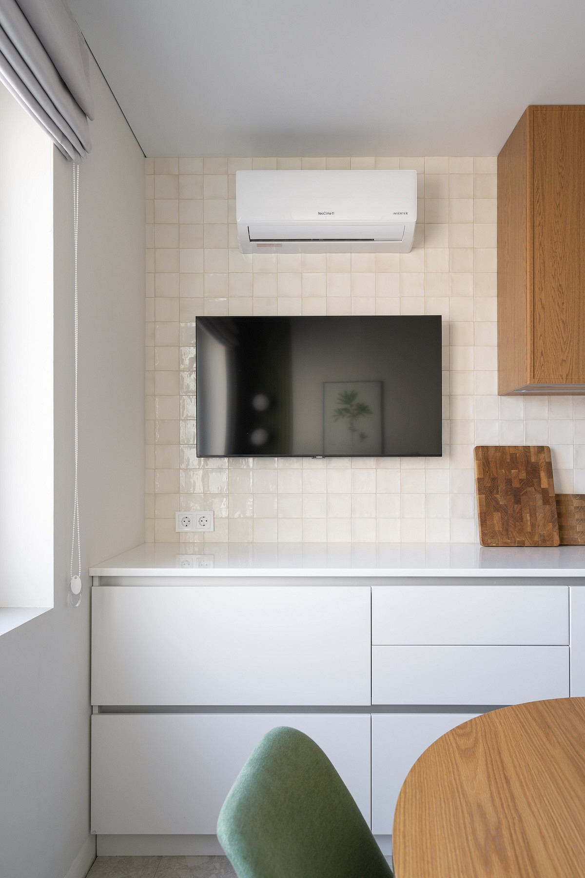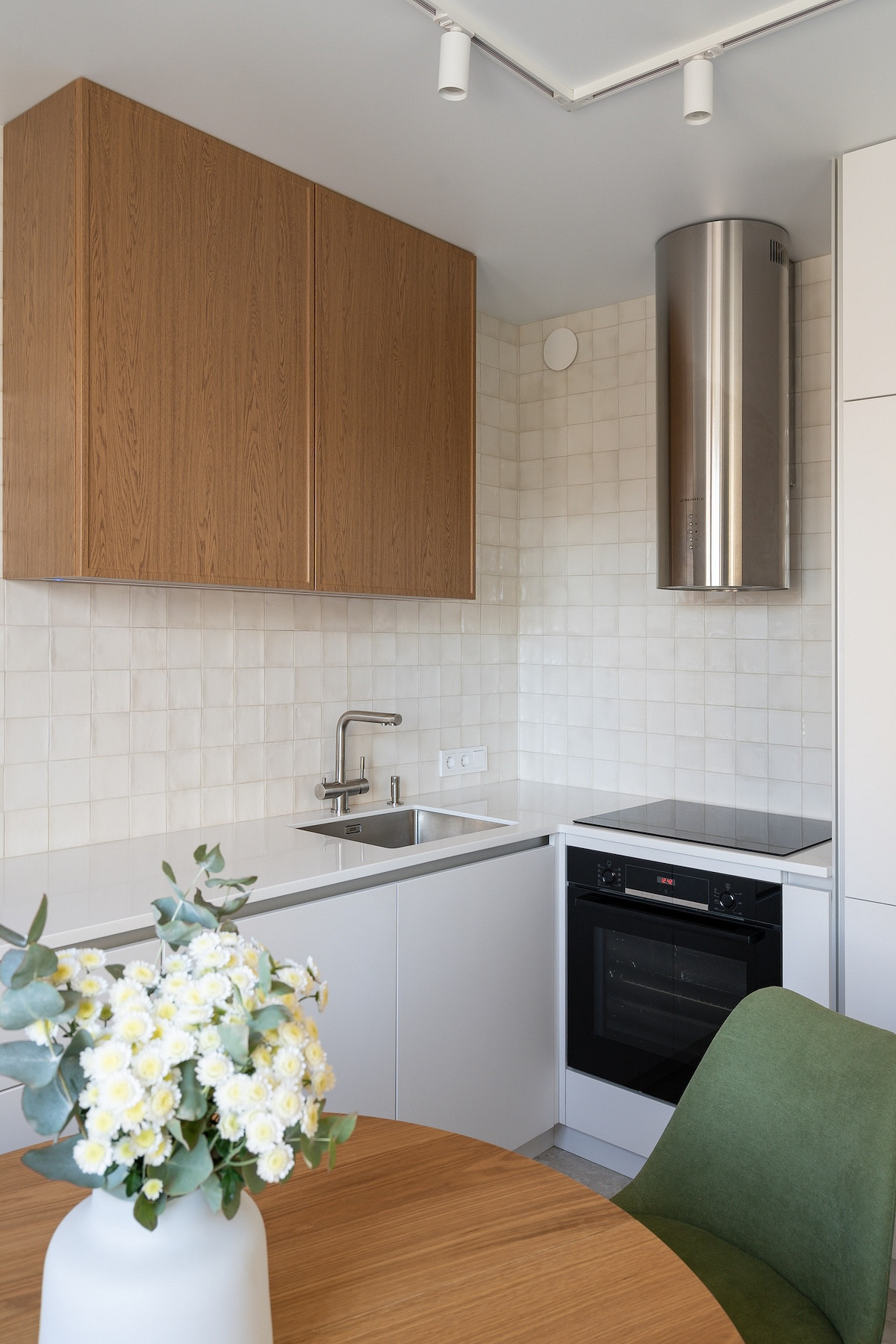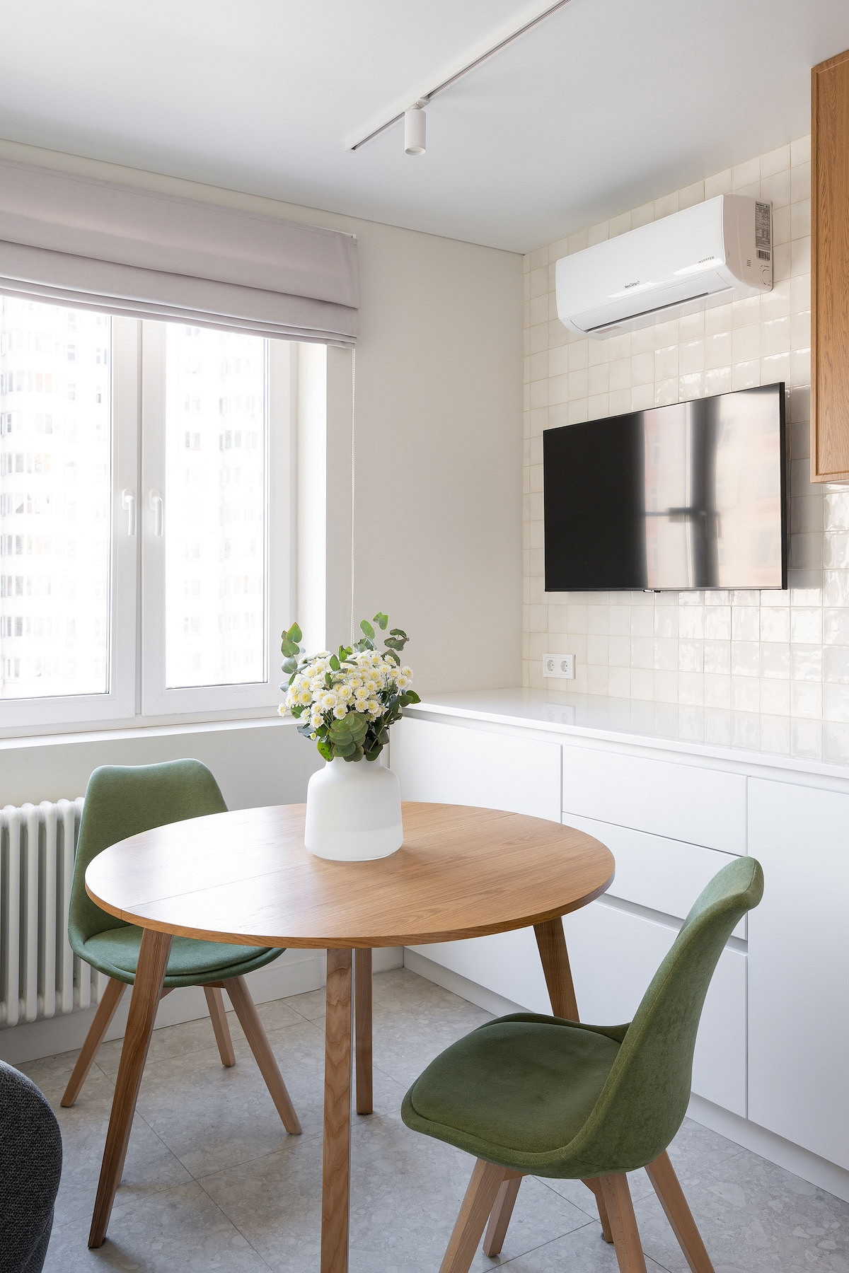 Проект Даниэлы Васюниной — преображение квартиры типовой планировки в панельном доме для семьи. В интерьере нет ничего лишнего — хозяева выбрали скандинавский стиль с акцентом на практичность, а дизайнер его воплотила. Так как в квартире нет отдельной гостиной (обе комнаты отданы под спальни, хозяйскую и детскую), кухня выполняет еще и роль комнаты для семейного времяпрепровождения. Поэтому в обеденной группе есть маленький диванчик, часть верхних шкафов гарнитура заменили телевизором. Светлые стены и белый цвет фасадов делают пространство визуально больше, а ненавязчивые акценты (фасады под дерево, зеленый цвет панелей в углу, серая обивка дивана, зеленая — стульев) добавляют уюта.