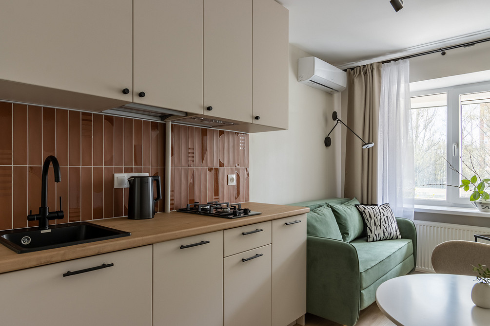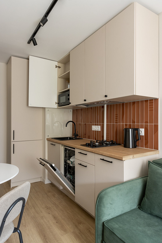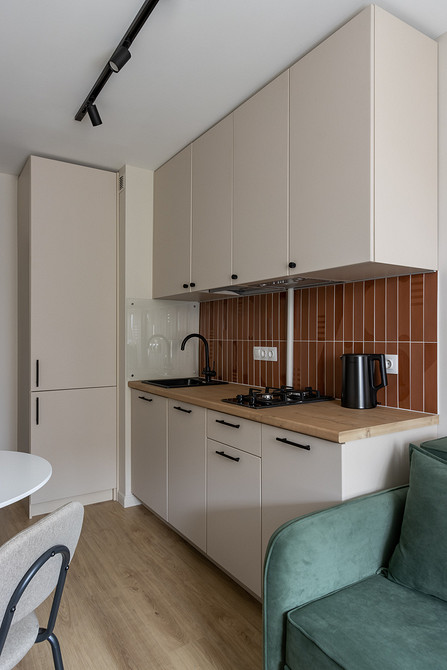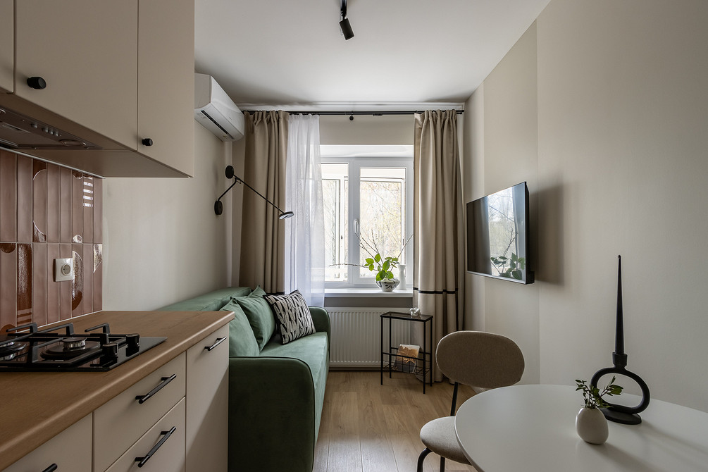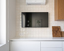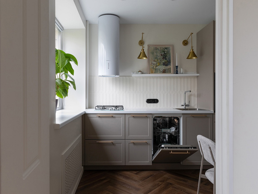 Эта квартира расположена в типовом доме в Санкт-Петербурге. Хозяева получили ее в наследство и пригласили дизайнера Екатерину Шейн, чтобы сделать ремонт и сдать недвижимость в аренду. Кухня — не маленькая, почти 10 кв. м, но вытянутая. В углу — выступ с коммуникациями, который нельзя убирать. Екатерина смогла разместить на этой площади не только кухонный гарнитур, но и мини-диванчик. Короб нарастили, чтобы выровнять геометрию и установить шкаф со встроенным холодильником. Основной гарнитур расположили линейно, предусмотрев необходимую технику: варочная панель, посудомоечная машина, микроволновая печь в верхнем шкафу. Диванчик у окна с телевизором напротив играет роль маленькой гостиной.