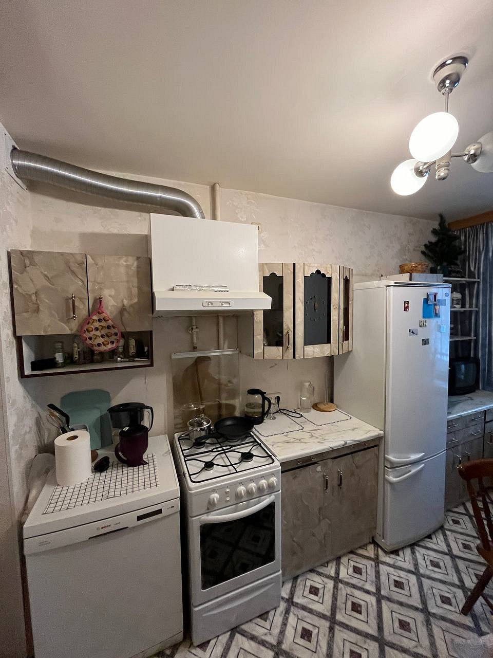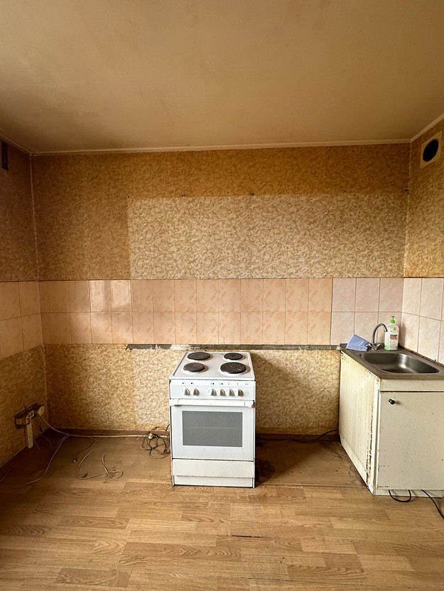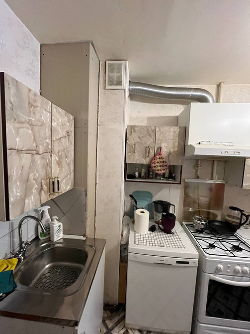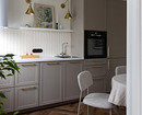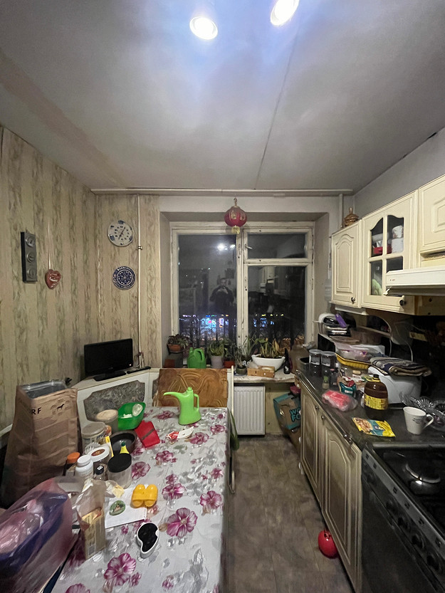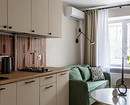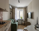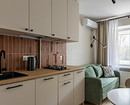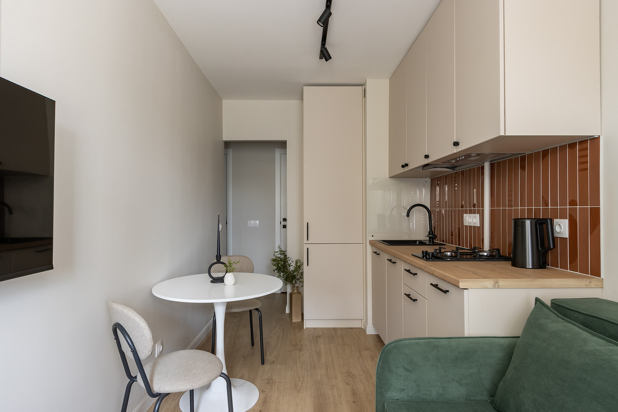 Эта квартира расположена в типовом доме в Санкт-Петербурге. Хозяева получили ее в наследство и пригласили дизайнера Екатерину Шейн, чтобы сделать ремонт и сдать недвижимость в аренду. Кухня — не маленькая, почти 10 кв. м, но вытянутая. В углу — выступ с коммуникациями, который нельзя убирать. Екатерина смогла разместить на этой площади не только кухонный гарнитур, но и мини-диванчик. Короб нарастили, чтобы выровнять геометрию и установить шкаф со встроенным холодильником. Основной гарнитур расположили линейно, предусмотрев необходимую технику: варочная панель, посудомоечная машина, микроволновая печь в верхнем шкафу. Диванчик у окна с телевизором напротив играет роль маленькой гостиной.