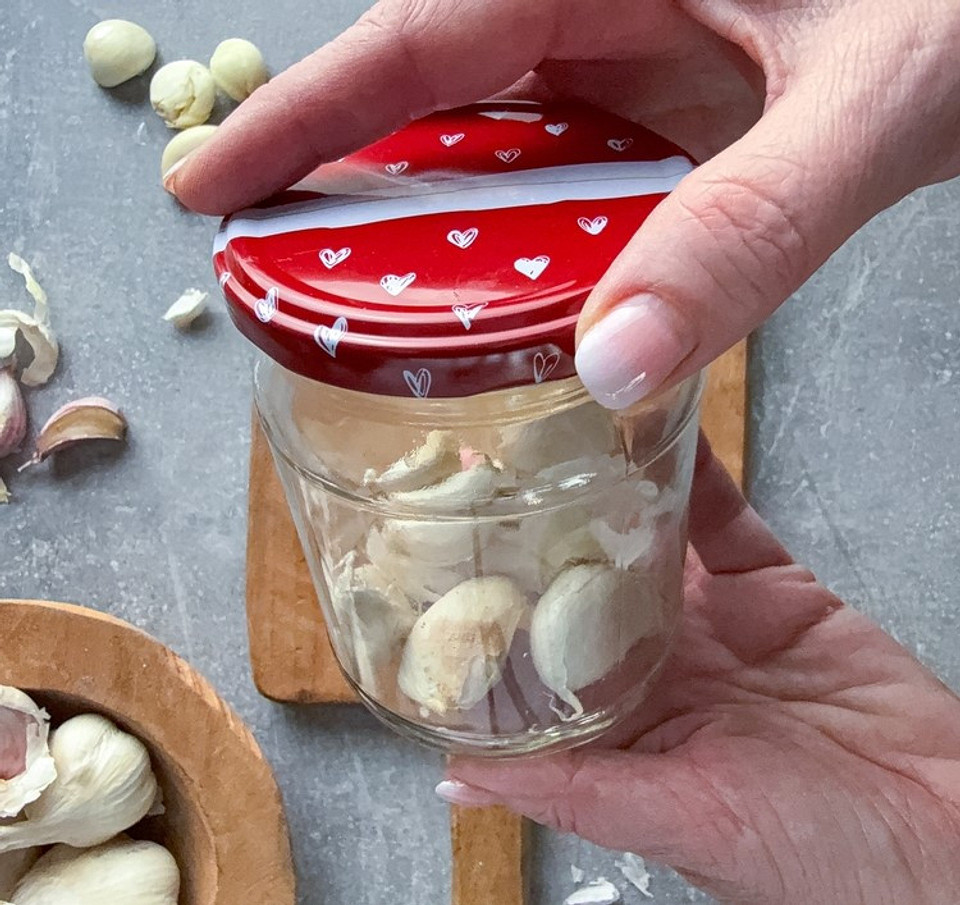 После этого надо подготовить чесночные головки. Для этого их разбирают на зубчики. Можно сделать это вручную, но лучше ускорить процесс. Головку кладут на разделочную доску, нажимают на верхушку ладонью, собирают разделившиеся зубцы. Складывают их в подготовленную емкость, накрывают крышкой и активно встряхивают 25-30 секунд. Потом открывают крышку, вытряхивают шелуху, при необходимости повторяют процедуру. Очищенные таким способом зубчики полностью сохраняют все свои качества.