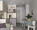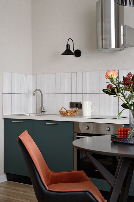Очевидный способ сократить бюджет на кухню — отказаться от части мебели. Относительно «безболезненно» это можно сделать разве что с верхними шкафами. Если в семье нет большого количества посуды, мелкой бытовой техники и не делают больших запасов бакалеи, это может сработать. В этом проекте квартиры под сдачу Татьяна Маланьина так и поступила. В студии это еще и дало ощущение «воздуха», что так необходимо в маленьких пространствах.