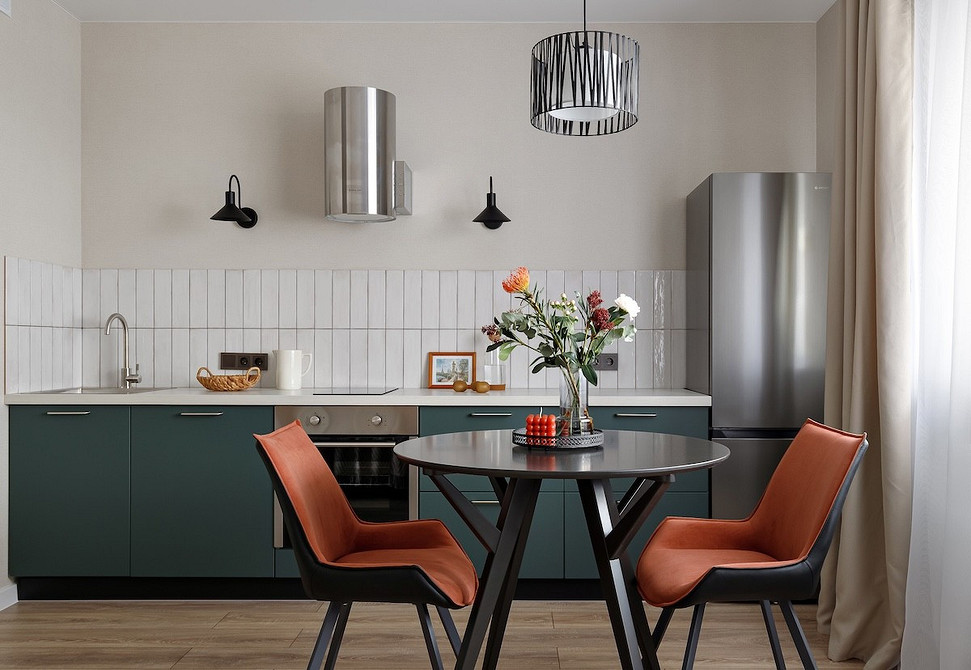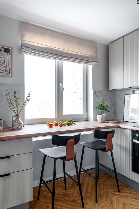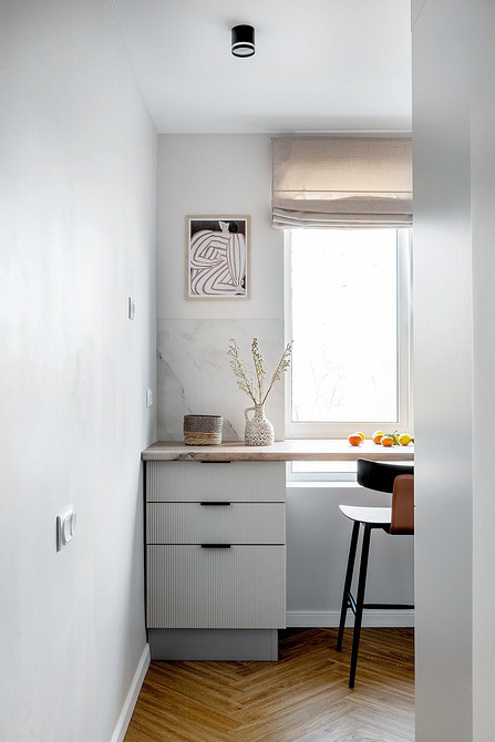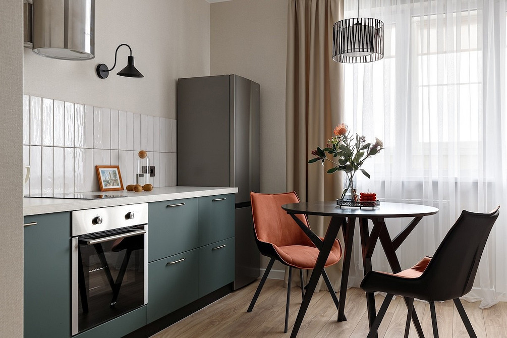 Дизайнер Мария Саблина оформила эту квартиру «выходного дня» для семейной пары в Воронеже. Кухня совсем небольшая, здесь не требовалось оборудовать вместительное хранение и предусматривать большой набор техники. Вместо фасада нижний шкаф под варочной панелью закрыли шторкой — таким образом и сэкономили, и добавили уюта.