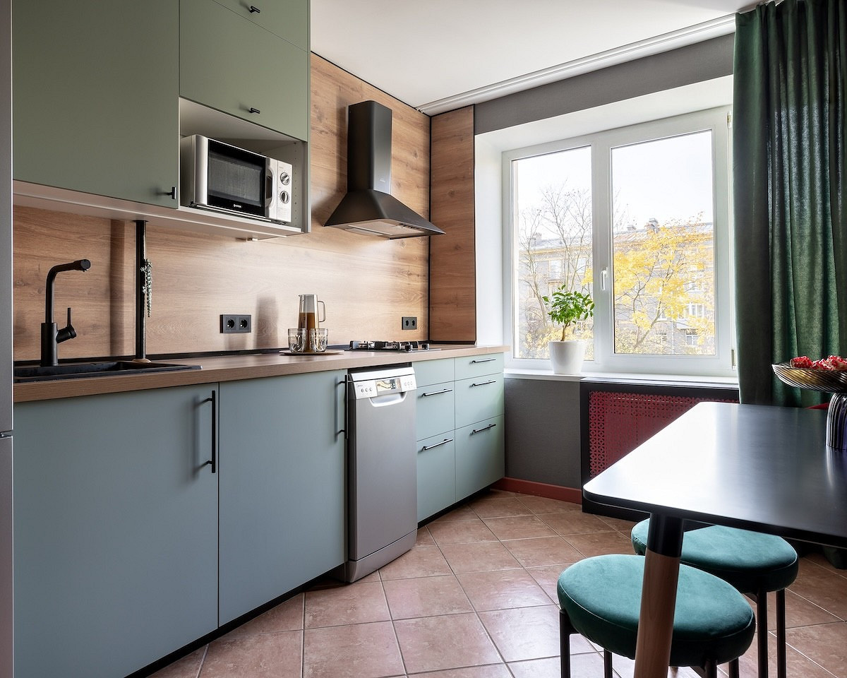 Бытовая техника всегда занимает значительную часть в общей стоимости кухни. Поэтому, если кухню обустраивают не с нуля, и та техника, что раньше была, еще пригодна и выглядит хорошо, есть смысл ее сохранить. Так сделала дизайнер Анна Маркова в обустройстве этой квартиры. Кухонный гарнитур — новый. Однако посудомоечную машину, вытяжку, микроволновую печь оставили. При этом они отлично вписались в обновленное пространство.
