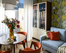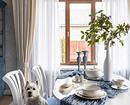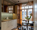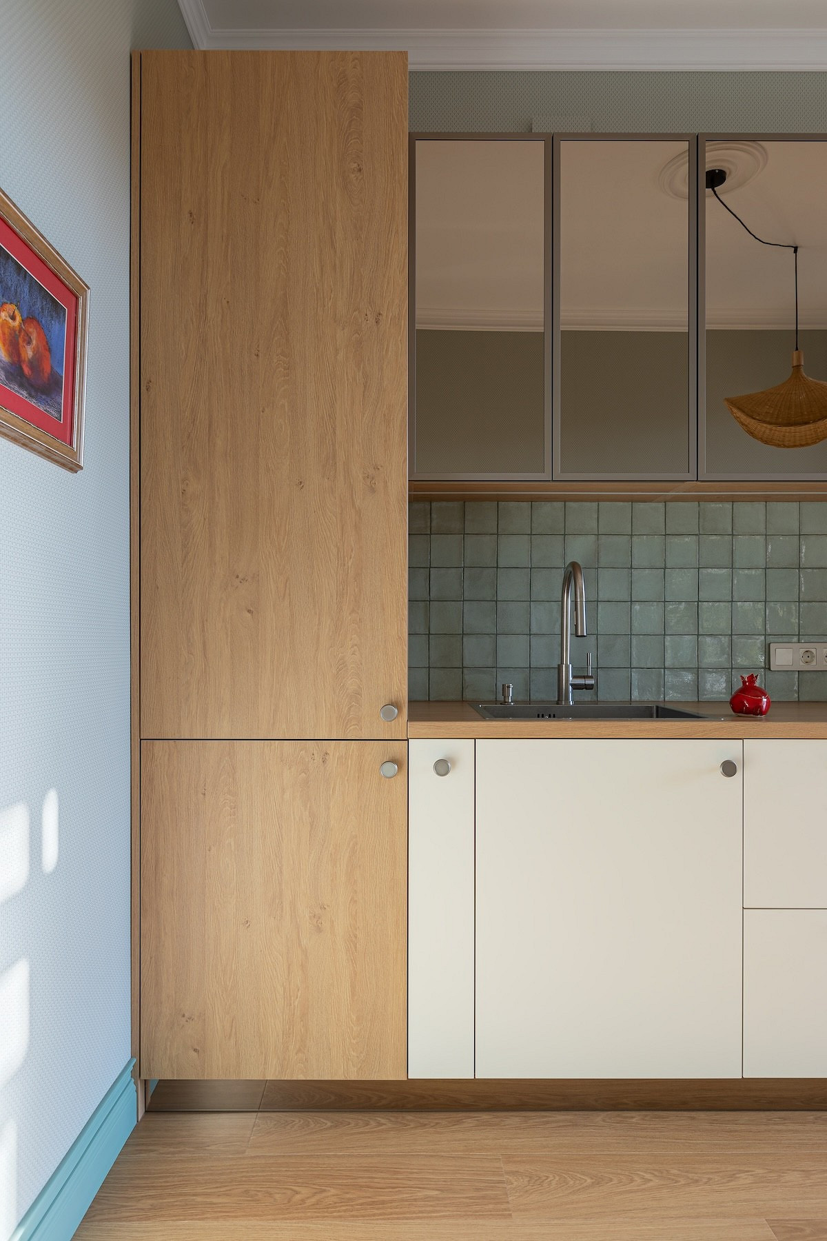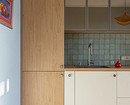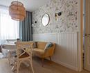 Кажется, что на кухне в этой квартире — однотонные стены. Но если присмотреться, видно легкую геометрию. Дизайнеры Екатерина Есина и Ирина Сойтюрк выбрали обои в голубой гамме, и они стали прекрасным фоном для ламината под дерево на полу, кухни с фасадами в белом цвете в комбинации с корпусами и дверками под дерево и с тонированными зеркалами на фасадах верхних шкафов. Бирюзовая плитка на фартуке тоже сочетается с обоями. А насыщенного желтого цвета шторы, плетеный абажур подвесного светильника помогают создать впечатление «отпускного» интерьера — то, чего, собственно, и добивались дизайнеры.