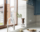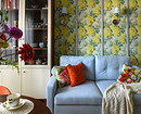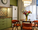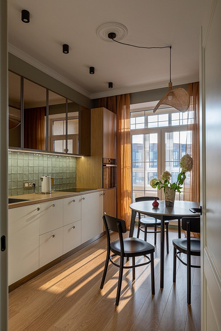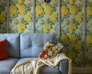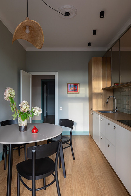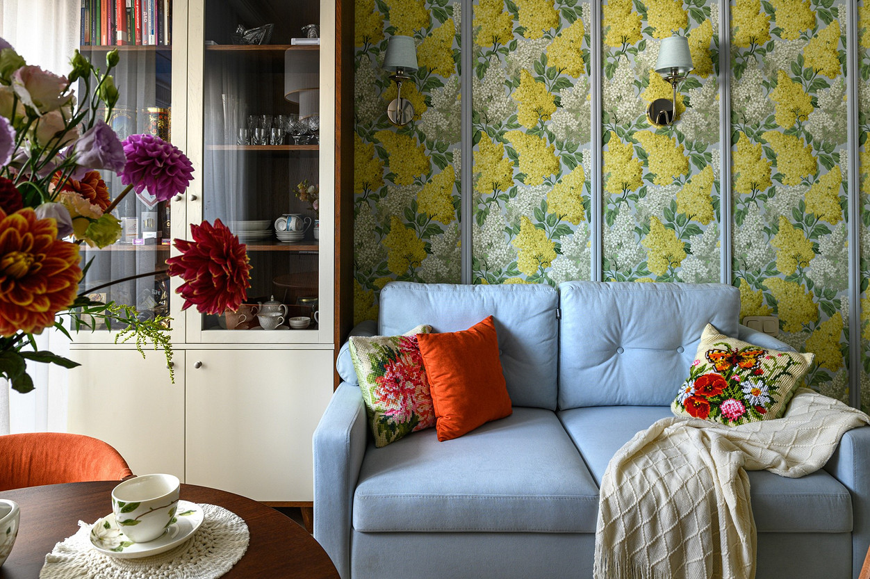 Другая интерпретация «цветов» на обоях — в квартире по проекту Татьяны Баклановой. Интерьер создавался для женщины, которая приобрела это жилье в Тамбове (городе, где она родилась), чтобы приезжать, как на дачу. Поэтому стиль выбран соответствующий: легкий, где было бы приятно отдыхать. На кухне, как и в других комнатах, поклеили акцентные обои. На них изображена сирень в желтых и белых тонах на серо-голубом фоне. Обои отлично сочетаются с зеленым кухонным гарнитуром и яркой плиткой на фартуке. А вертикальные молдинги придают пространству ритм и помогают визуально увеличить высоту потолка.