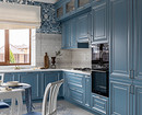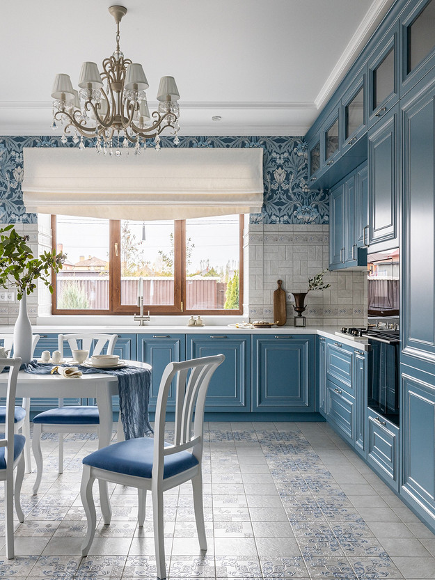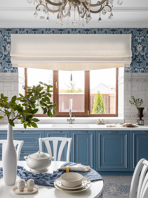 Этот загородный дом по проекту Ольги Магановой принадлежит семейной паре. В интерьере они просили использовать их любимую голубую гамму и создать отсылки к провансу. Однако для кухни выбрали обои в английском стиле. Это коллекция с оригинальными архивными принтами известного английского художника Уильяма Морриса. Обои сразу полюбились хозяйке дома, и она захотела видеть их на своей кухне. Яркие полотна разместили на стене над кухонным фартуком, выложенным светлой плиткой, а также над окном, которое находится рядом с обеденным столом.