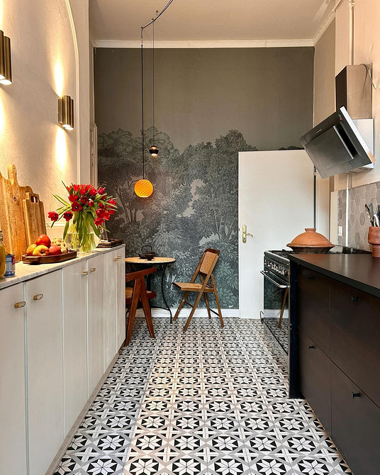 Темные полотна можно клеить в том числе в маленькой кухне — только акцентно. Фон обязательно поддержите парой других контрастных деталей: это могут быть элементы мебели, фурнитура, смесители или мелкий декор.