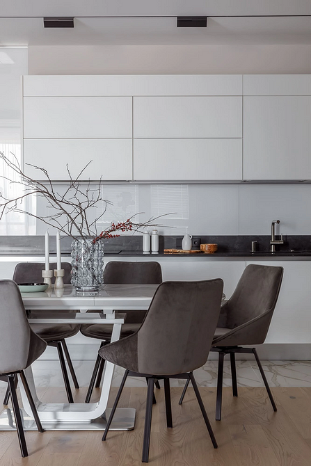 Глянец смотрится роскошно и эффектно. А еще дополнительно отражает свет и тем самым делает комнату визуально просторнее. Главное — не переборщить с количеством, иначе пространство будет бликовать и из-за этого может раздражать.