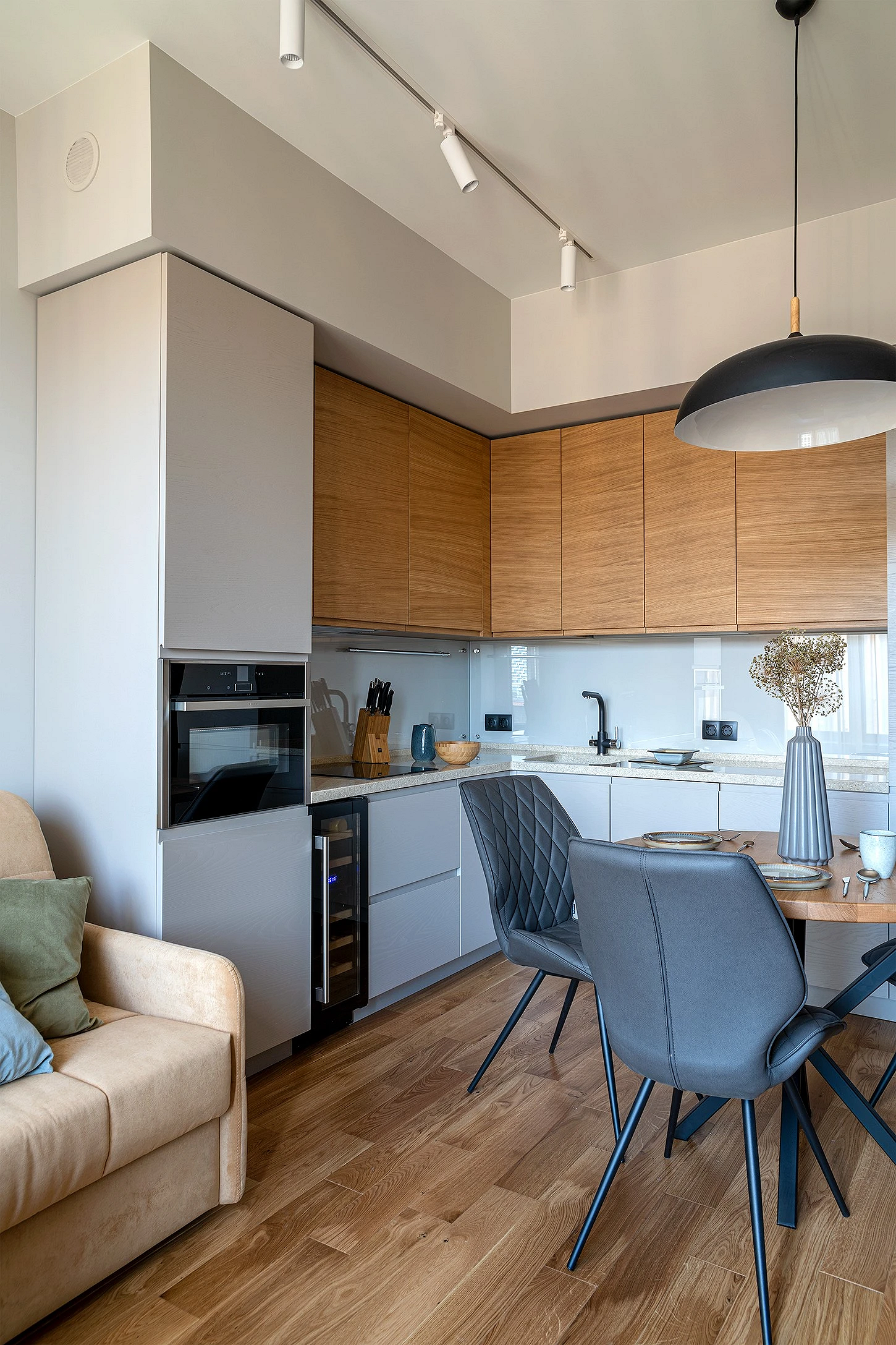 Дерево — благородный натуральный материал. Экологически чистый, безопасный для здоровья, красиво выглядящий. И, конечно, дорогой. Древесина не выдерживает постоянного контакта с водой и паром, повышенной влажности — она рассыхается, деформируется, может начать гнить или стать источником плесени. Поэтому оформление из массива на кухне используют редко — и только вне мокрых зон: например, в той части комнаты, где стоит обеденный стол или диванная группа.