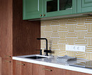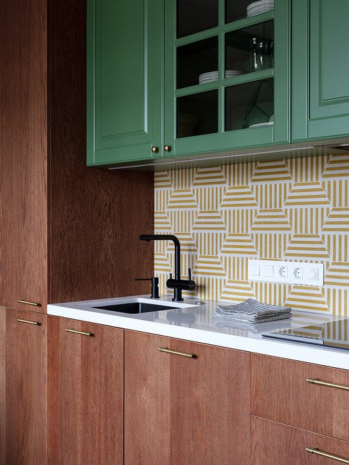 Геометрический рисунок — всегда эффектное решение для интерьера. В этом проекте дизайнер Вера Шеверденок выбрала для фартука плитку в форме шестиугольников с рядами полос, расположенных вертикально и горизонтально. Желтый цвет полос хорошо сочетается со шпонированными фасадами и зелеными дверцами верхних шкафов. Белый фон плитки скомбинирован с белой столешницей.