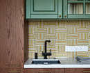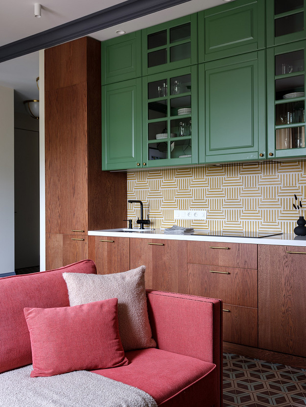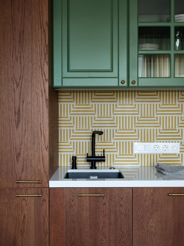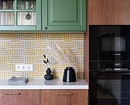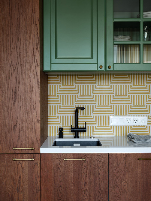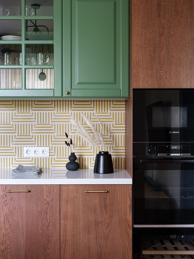 Фартуки с «кухонной» тематикой считаются антитрендом. Но есть нюанс: к антитрендами причисляют панели с нарочито крупными фруктами, кофейными зернами и подобными рисунками. В этом проекте дизайнер Эльвира Мисюро выбрала плитку с декоративными вставками, на которых изображены лимоны. Декоративные плиточки сочетаются с нейтральными белыми и зелеными — поэтому отделка не выглядит перегруженно. Фартук скомбинировали в интерьере с приглушенными зелеными фасадами кухонного гарнитура и керамическими ручками.