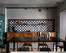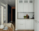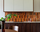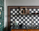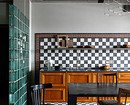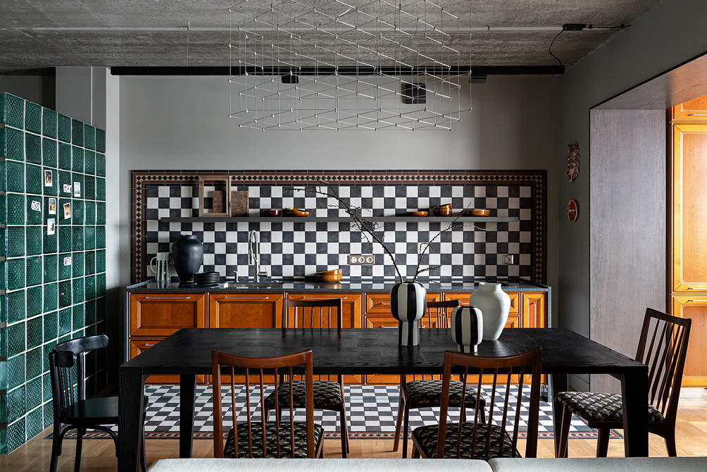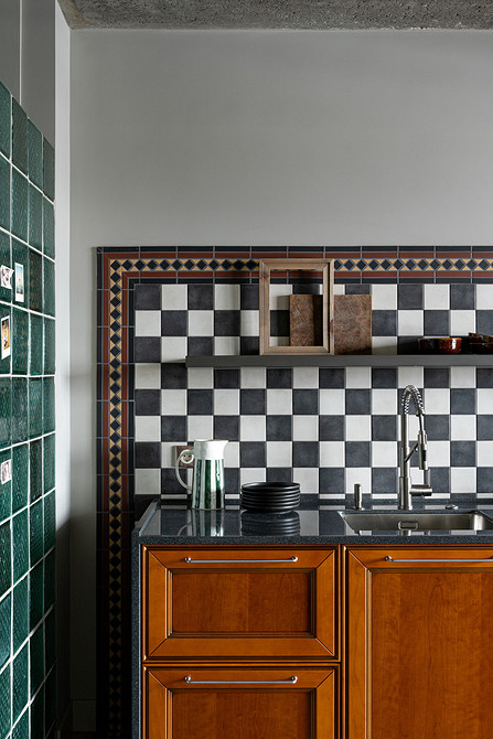 В своей квартире дизайнер Ксения Крылова выбрала необычную отделку для кухонного фартука. Квадратные плитки черного и белого цветов выложили наподобие шахматной доски с красивым «бордюром» из мелких фрагментов плитки. Таким же способом оформлен пол на кухне. Кухонный гарнитур — с деревянными фасадами, которые отлично сочетаются с черно-белой плиткой и коричневыми фрагментами бордюра.