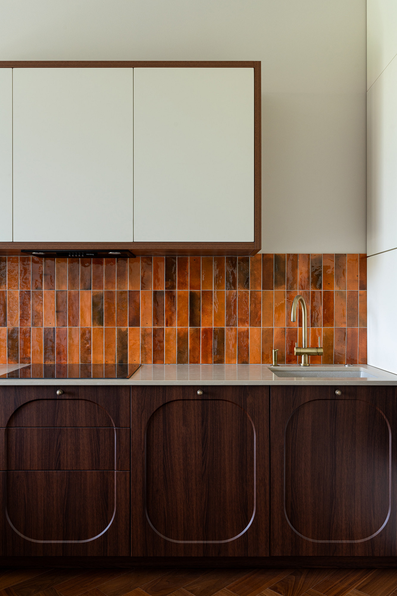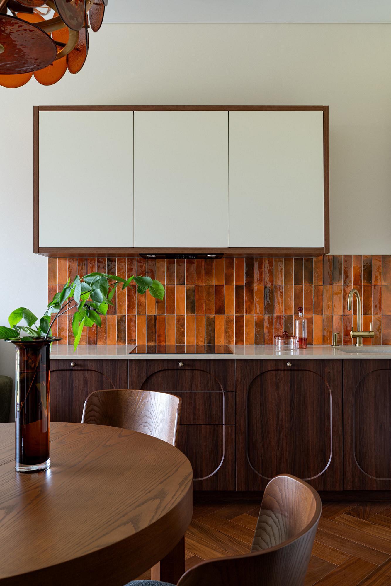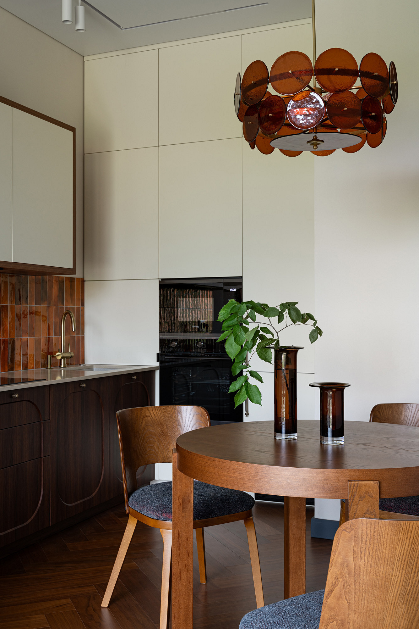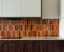 В этом проекте дизайнера Любови Вербах реализовано необычное сочетание цветов: медовый в разных оттенках, шпон ореха, палисандра и красного дерева, полы цвета тика. Отправной же точкой в дизайне стала плитка на фартуке, имитирующая янтарную отделку. Мелкоформатные плиточки разных оттенков коричневого (от оранжевого до почти красного) эффектно выглядят в сочетании с фасадами кухни под дерево, верхними шкафами молочного цвета и такой же столешницы.