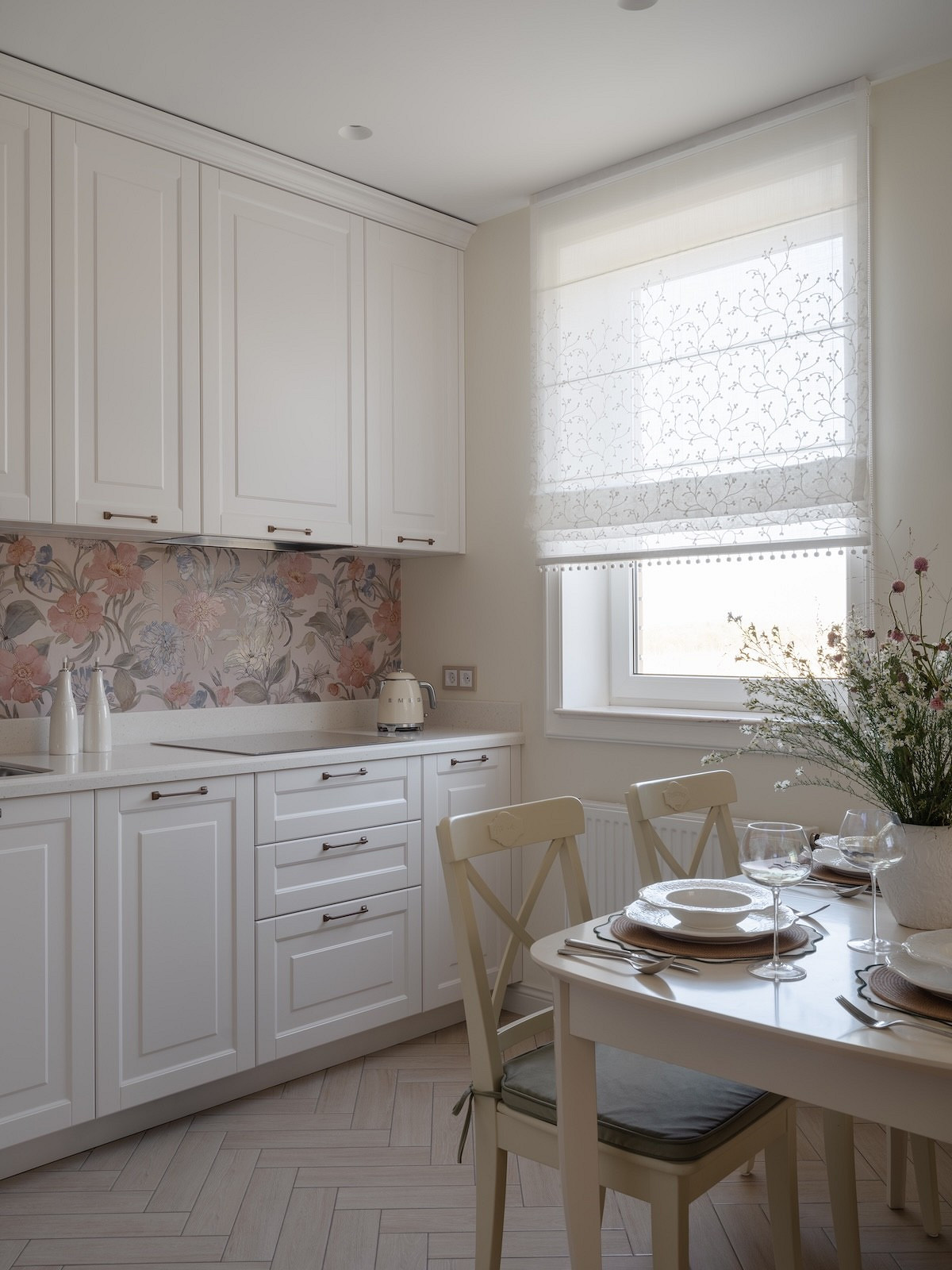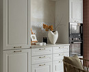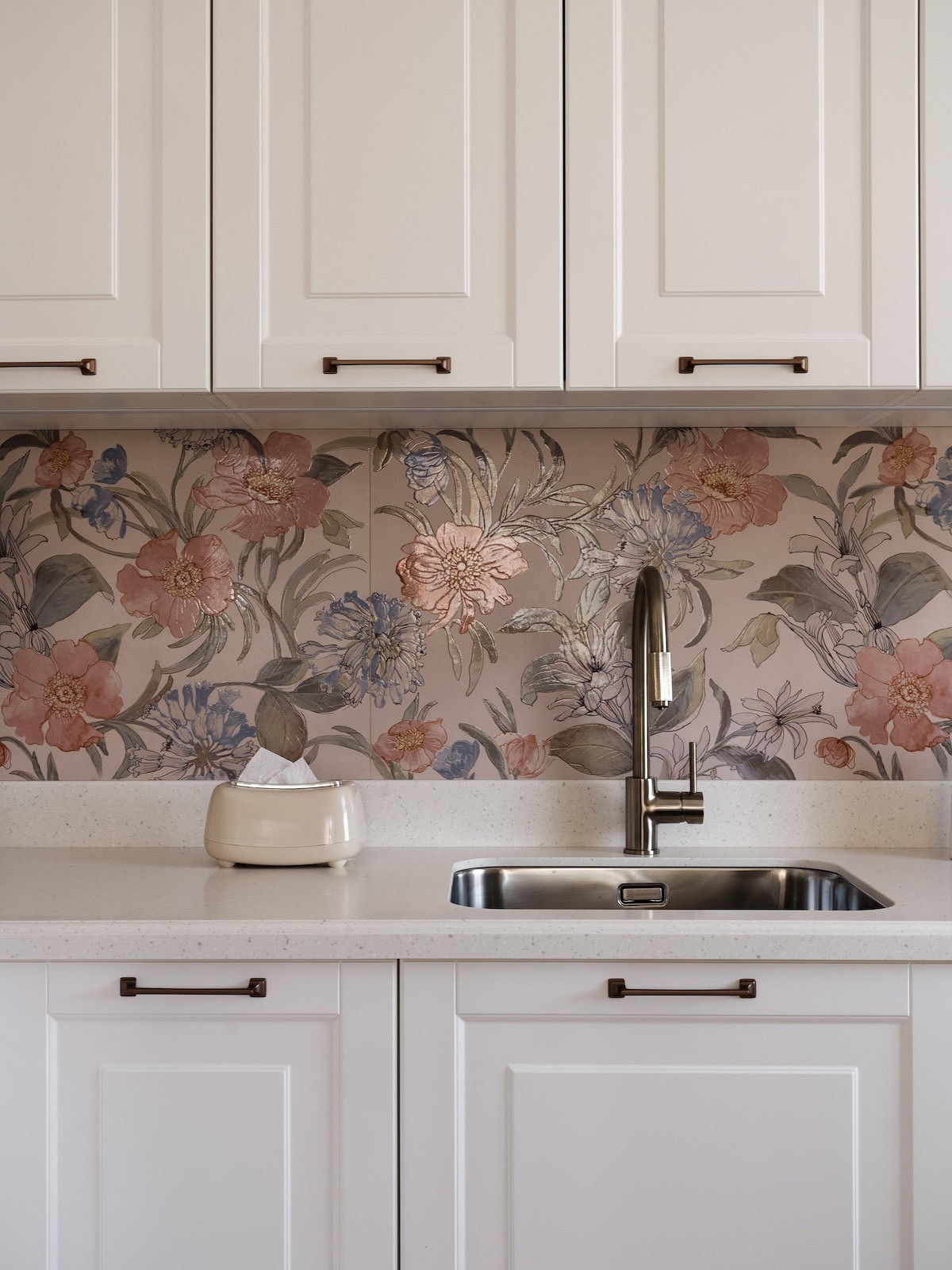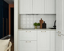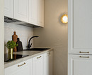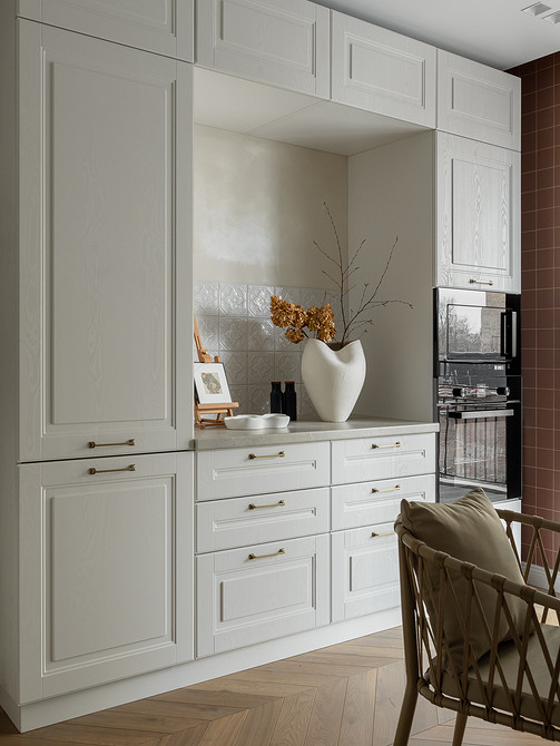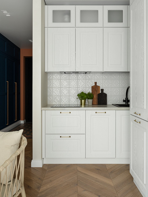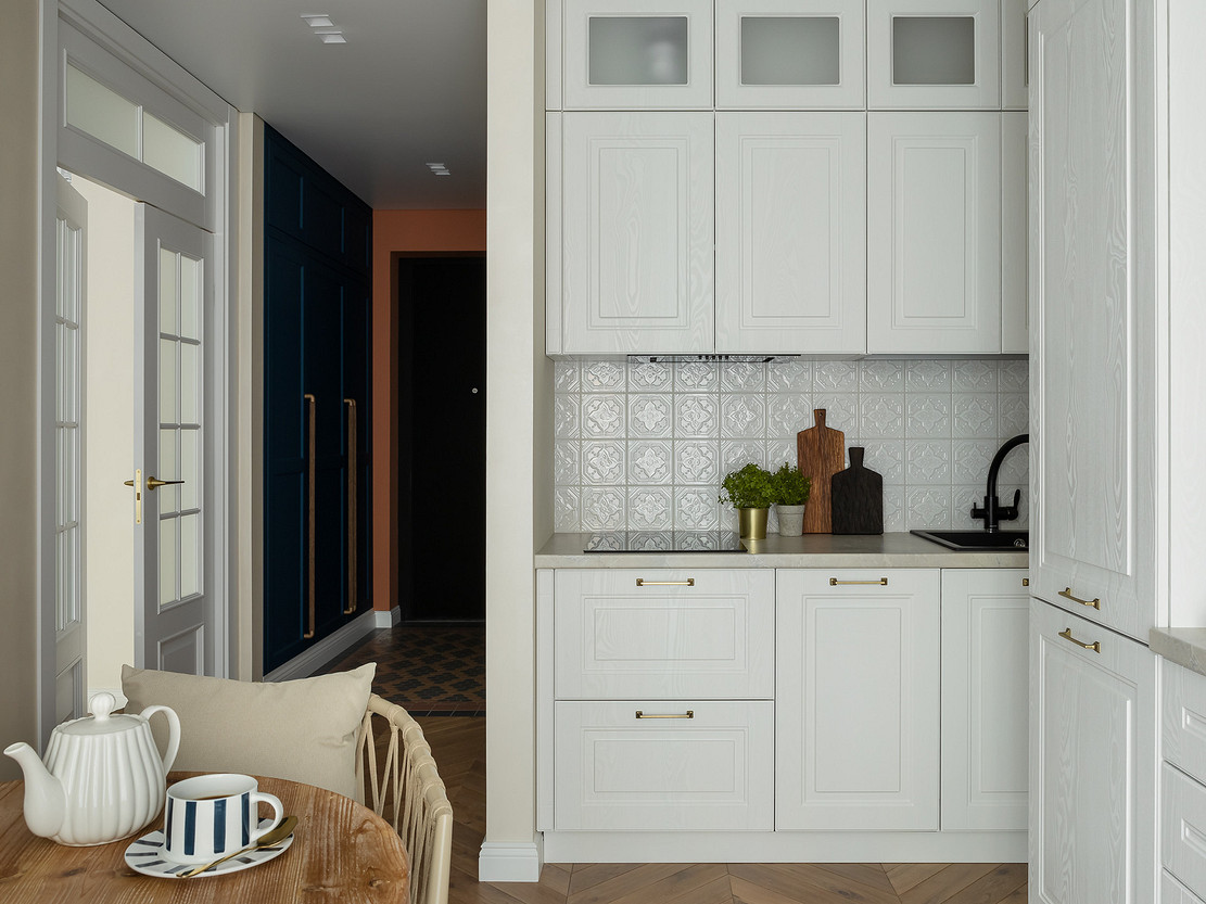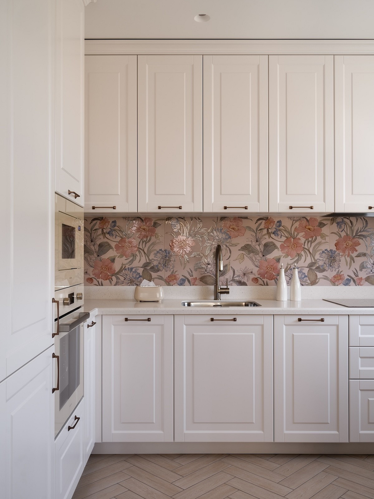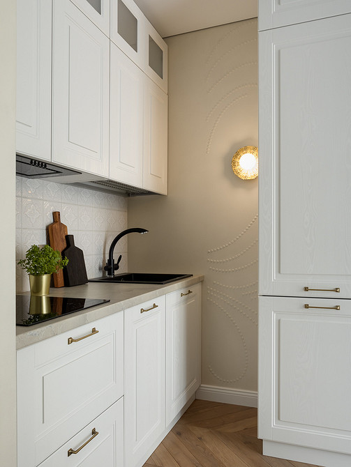 Плитка с таким рисунком в отделке фартука — удачный выбор для интерьеров в классической стилистике или с акцентами в стиле прованс. В этой квартире по проекту дизайнеров Татьяны Кулинченко и Виктории Домоцевой создан как раз такой интерьер. В нейтральной кухне со светлыми фасадами с филенками фартук выступает единственным заметным акцентом, и пространство выглядит элегантно.