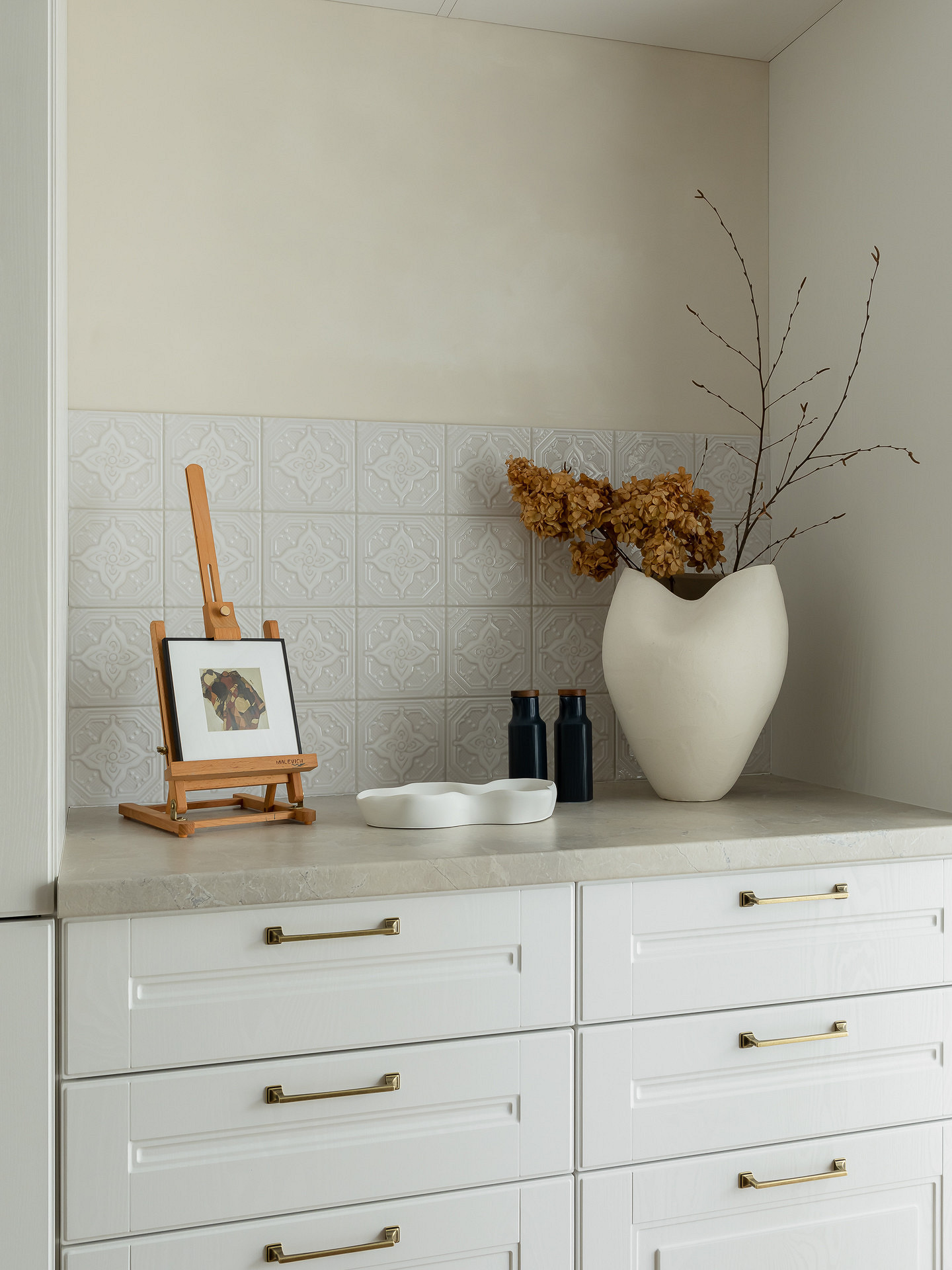 Сделать акцент на фартуке можно не только с помощью цвета или необычного варианта укладки. В этой квартире по проекту Ксении Муравьевой на фартуке уложена плитка в стиле майолики — она нейтрального белого цвета с выпуклым узором. Дизайнер хотела добавить в интерьер средиземноморские акценты, и такая плитка стала одним из элементов, которые помогли с этим.