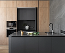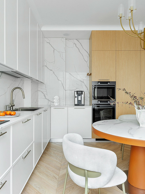 В 2026-м на фото дизайна кухонь все чаще будет встречаться вертикальное планирование. Оно предполагает применение высоких колонн со скрытой техникой и потайными секциями. Гарнитур — монолитный, без видимых стыков. Встроенные системы выдвигаются на всю высоту, благодаря чему не нужно тянуться к верхним полкам.