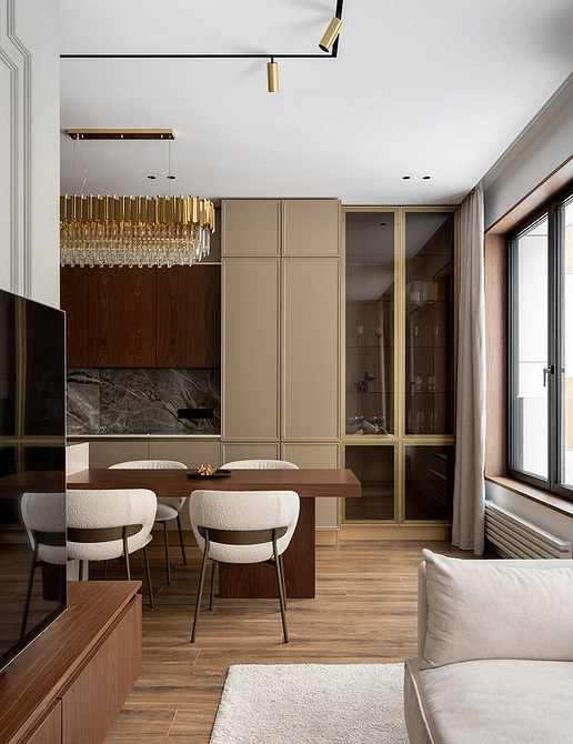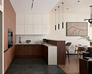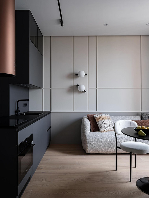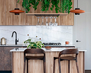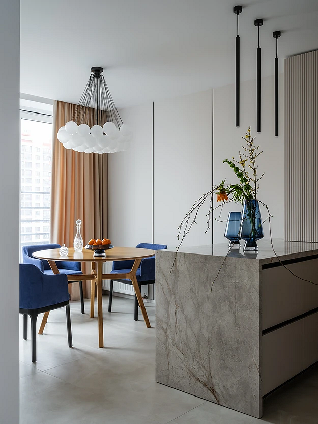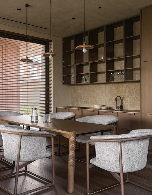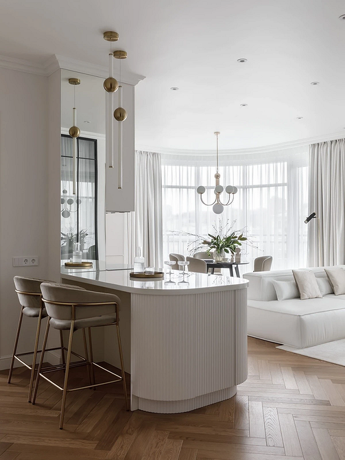 Барные стойки и острова становятся центром общения: за ними можно завтракать, работать за ноутбуком или проводить вечер с друзьями. Появляются лаунж-зоны с креслами и диванами, объединенные общей палитрой и материалами с кухонной частью.