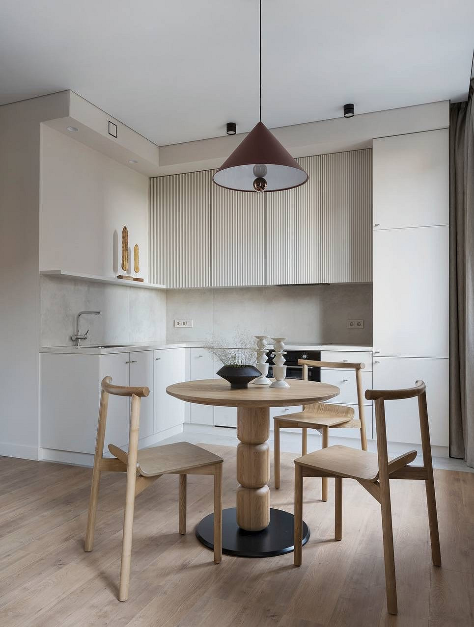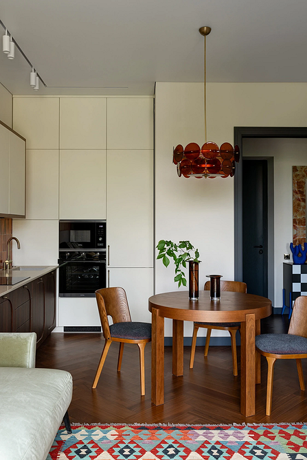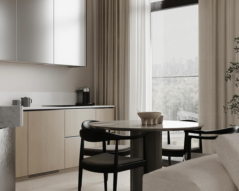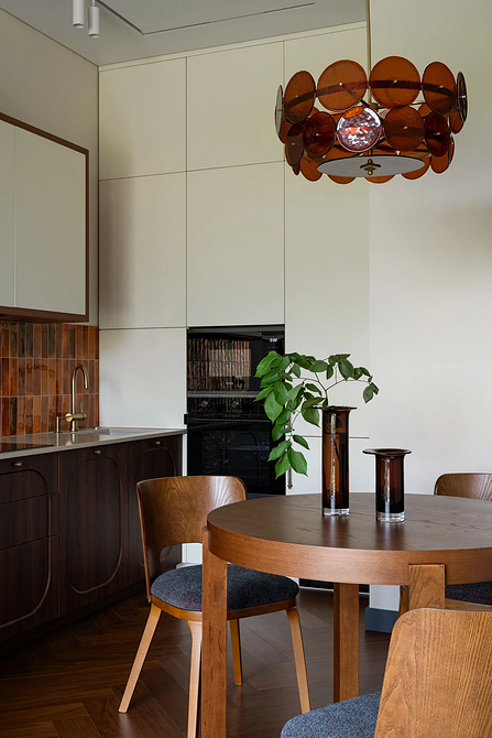 Главная идея — нейтральный фон с мягкими контрастными вкраплениями. Молочные и бежевые оттенки становятся базой, а глубокие природные тона играют роль акцентов. В сочетании с натуральными фактурами и матовыми поверхностями они формируют интерьер, который выглядит благородно и уютно.