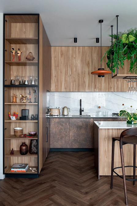 Экологичность уже не просто тренд, а базовый принцип современного интерьера. Кухня должна быть не только красивой, но и долговечной, безопасной для жильцов и окружающей среды. Тенденция проявляется в обращении к локальному производству (для снижения углеродного следа), использовании переработанных материалов и выбору энергоэффективной техники. Также многие выбирают встроенные системы сортировки мусора и компостеры для органических остатков.