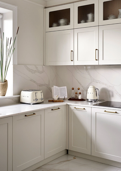 Фартук — полноценная часть дизайна. В 2026- в интерьере кухни он может быть как акцентом, так и частью общего фона, который поддерживает концепцию спокойного минималистичного оформления. В тренде цельные поверхности без швов, фактурность и природные оттенки.