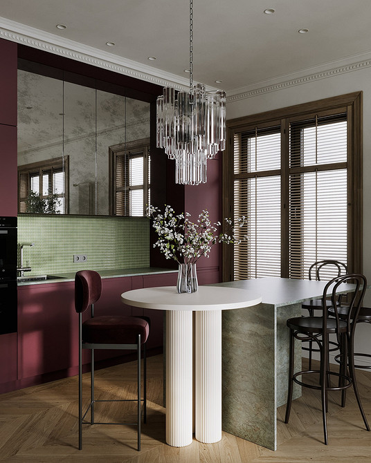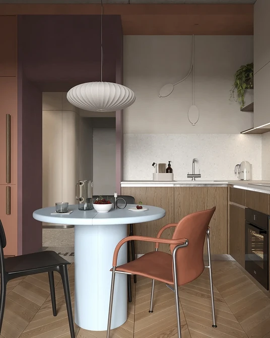 Тенденция к биофильному дизайну продолжает усиливаться. Помимо натуральных материалов и обилия растений, он проявляется в мягких линиях, плавных переходах и отсутствии острых углов. Скругленные острова, радиусные фасады, волнообразные столешницы, круглые столы и стулья делают пространство более уютным на подсознательном уровне. Такие формы не только эстетичны, но и снижают риск случайных бытовых травм (особенно если дома есть дети).