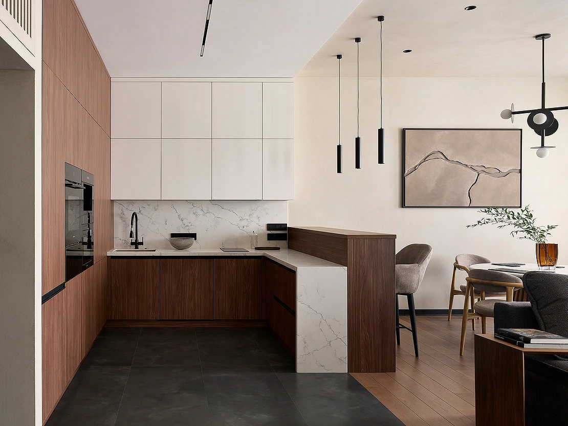 Современная кухня совмещает функции столовой, гостиной, иногда даже домашнего кабинета. Тренд поддерживает образ жизни, где готовка — лишь часть ежедневного сценария.