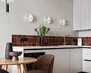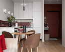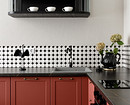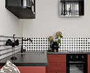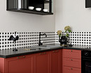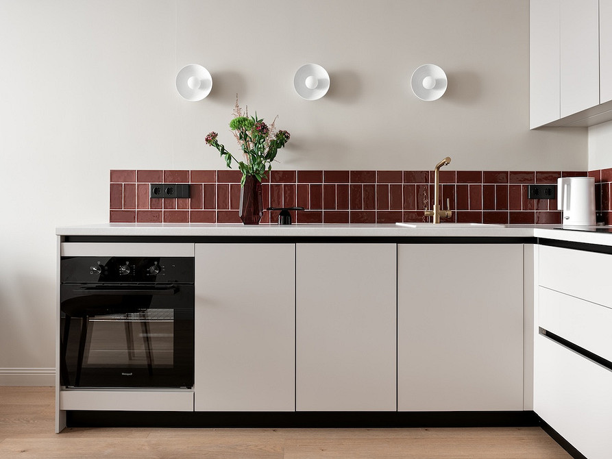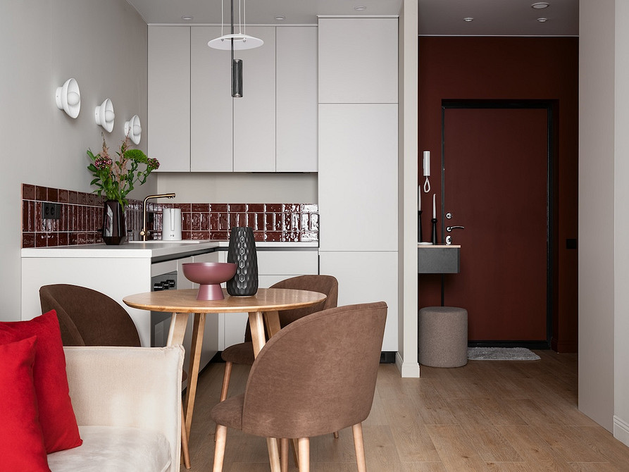 В этой квартире с готовым ремонтом от застройщика дизайнер и хоумстейджер Ольга Суворова создала эффектный интерьер, используя яркие акценты, рисунки и аксессуары. Так, кухонный гарнитур подобрали в красивом приглушенном красном цвете. Верхних шкафов нет, зато повесили верхнюю часть винтажного буфета черного цвета. Он сочетается с черной столешницей. Для фартука подобрали черно-белую плитку-мозаику. Черные акценты выгодно смотрятся на фоне светлых стен и отлично сочетаются с приглушенным красным цветом шкафов кухонного гарнитура.
